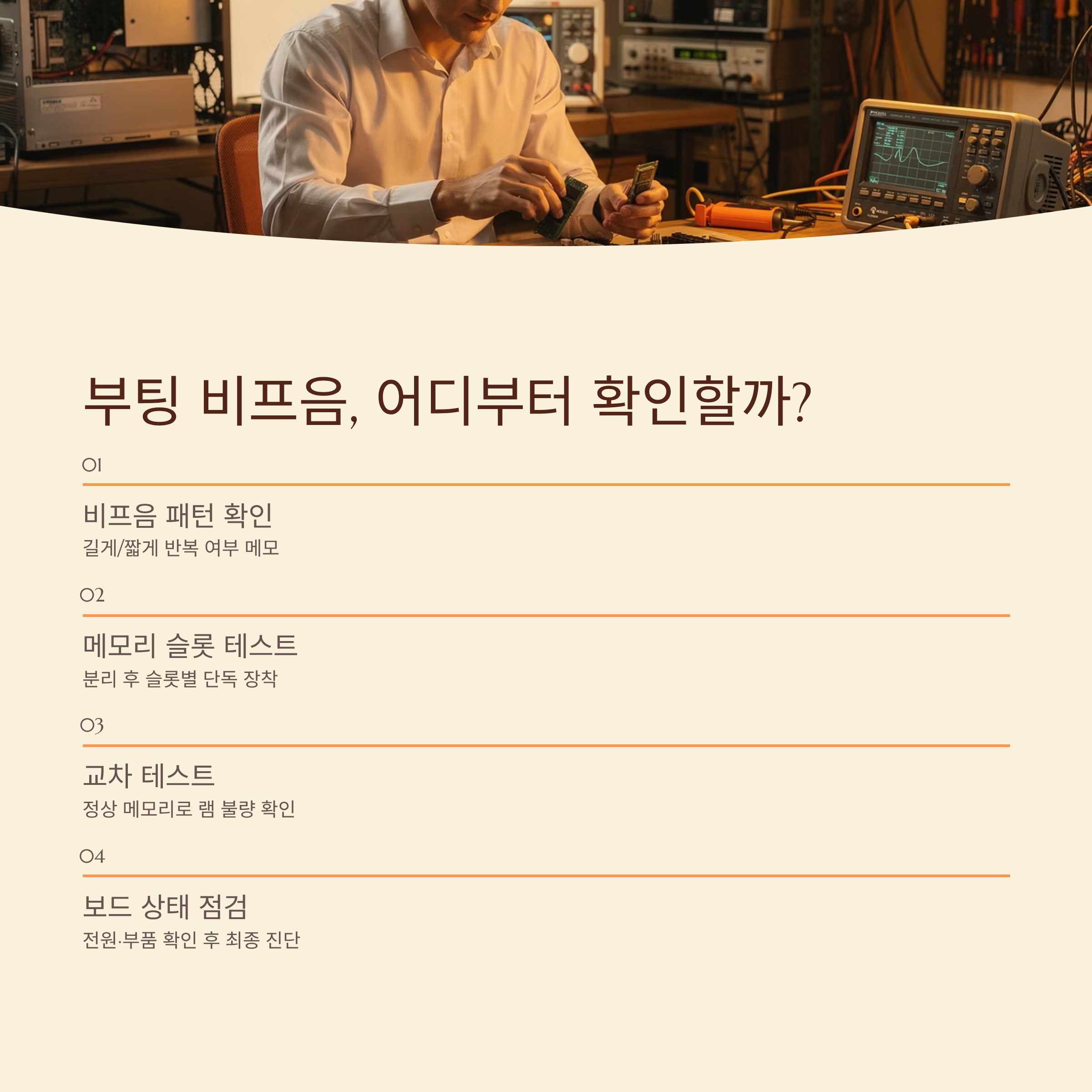 전원 공급 장치와 나머지 부품들도 간단히 점검해 봤지만, 문제의 중심은 결국 메인보드 쪽으로 좁혀졌어요. 특히 램을 꽂는 자리 중 한 곳에서만 이상 반응이 반복되는 걸 보고, 슬롯 접촉 상태와 주변 회로를 더 자세히 살펴보게 됐습니다. 아래 표처럼 부팅음이 날 때는 이런 순서로 하나씩 체크해 보는 게 좋아요.