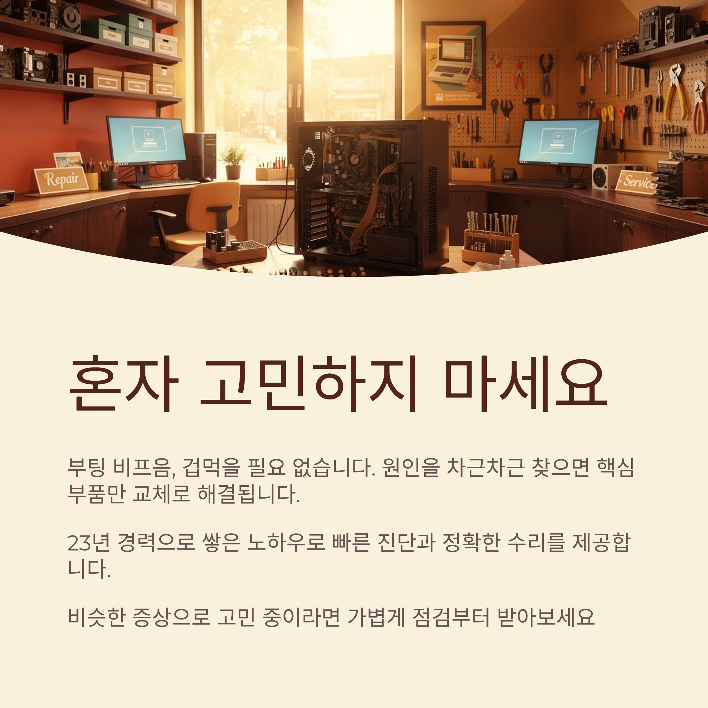 부팅할 때마다 삐- 소리가 길게 나기 시작하면, 괜히 큰일 난 것 같아서 컴퓨터를 켜는 것 자체가 스트레스로 느껴지실 수 있어요. 그렇다고 너무 겁먹으실 필요는 없는 게, 이번 사례처럼 원인을 차근차근 좁혀 가다 보면 꼭 전체를 새로 맞추지 않아도 핵심 부품만 교체해서 깔끔하게 해결되는 경우가 많거든요. 오랫동안 같은 자리에서 수리를 해 온 매장은 이런 패턴을 하나씩 쌓아 두었다가, 비슷한 증상이 들어오면 더 빠르게 방향을 잡을 수 있는 것도 분명한 장점이에요. 혹시 비슷한 상황으로 고민하고 계시다면, 혼자 오래 끙끙대지 마시고 가볍게 점검부터 받아 보셔도 좋겠어요.
