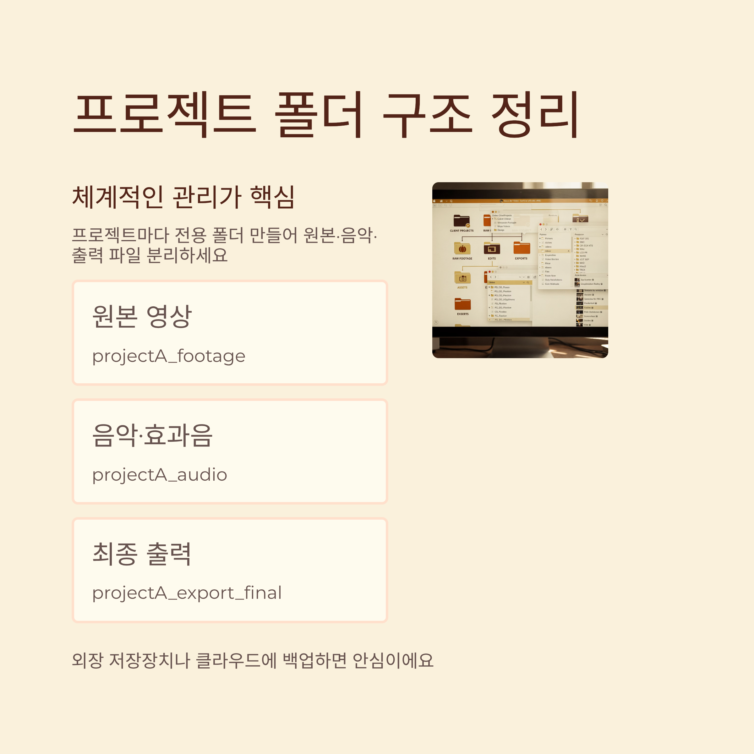 보통은 프로젝트마다 전용 폴더를 하나 만들고, 그 안에 원본 영상, 음악·효과음, 이미지, 출력 파일 폴더를 따로 두는 방식을 많이 써요. 이렇게 해 두면 다른 컴퓨터로 옮길 때도 전체 폴더만 통째로 복사하면 되니까, 링크가 끊어질 걱정을 크게 줄일 수 있어요.