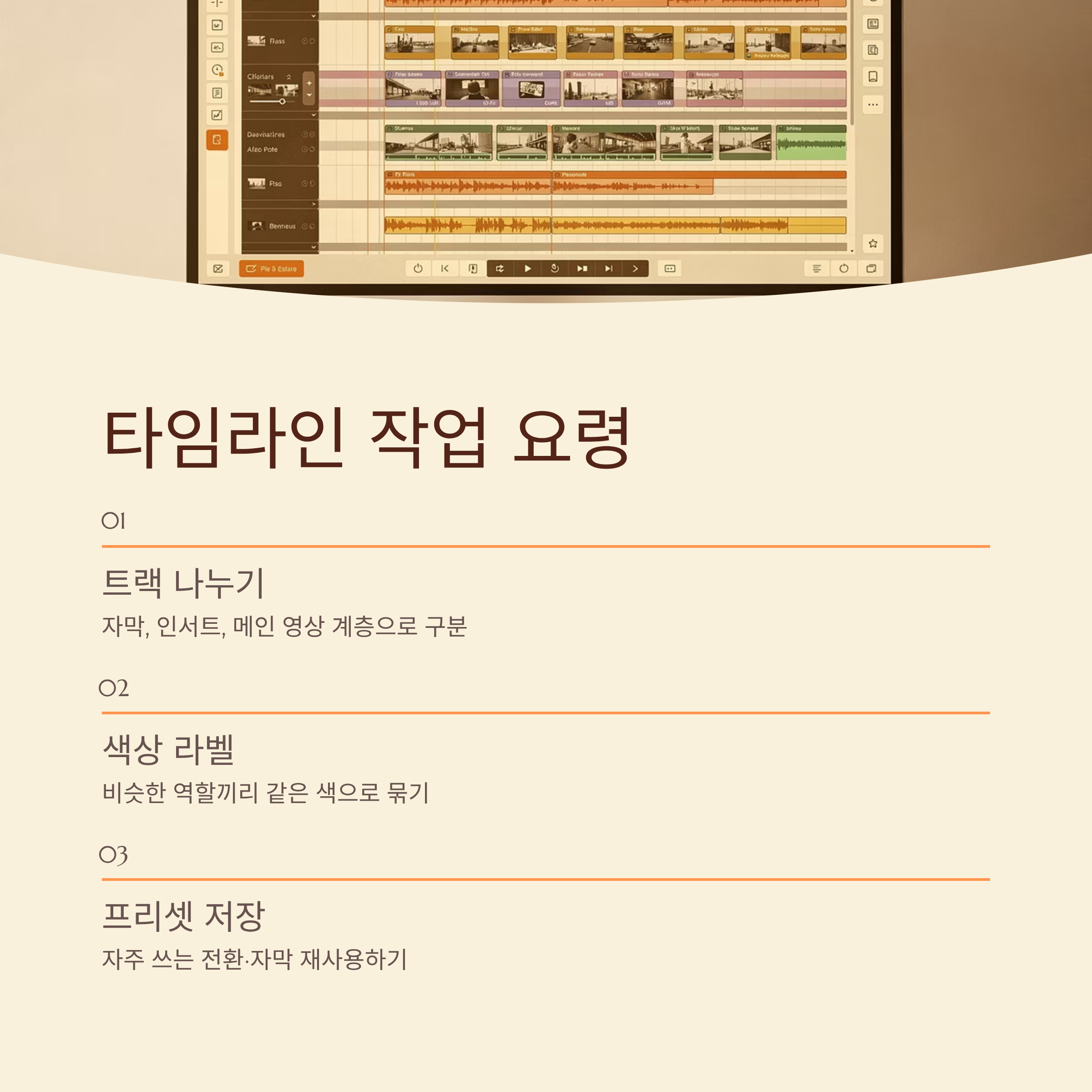 예를 들어 맨 위 트랙은 자막, 그 아래는 인서트용 짧은 영상, 가장 아래는 전체 길이를 담당하는 메인 영상을 넣는 식으로 계층을 나눠 보세요. 색상 라벨 기능이 있다면 비슷한 역할끼리 같은 색으로 맞춰 두면, 한눈에 구조가 들어와서 수정할 때도 부담이 줄어요.
