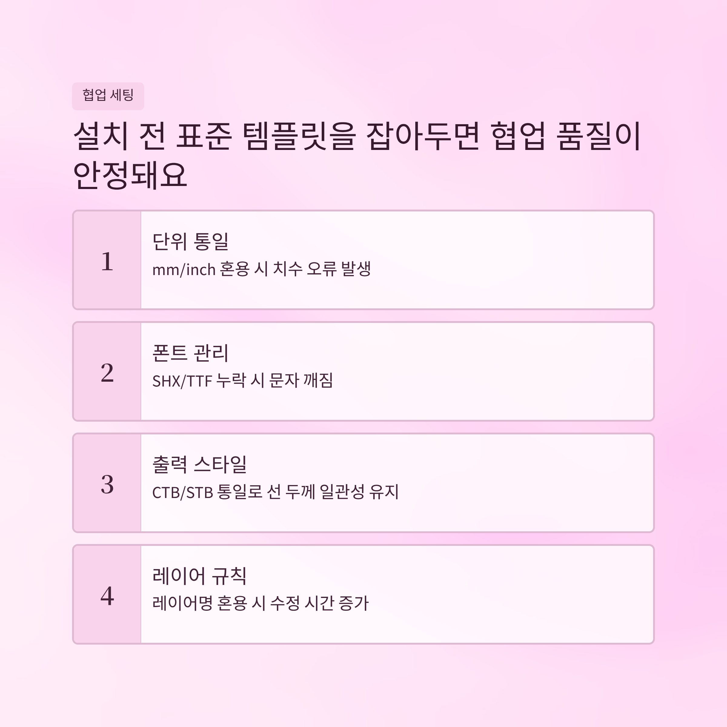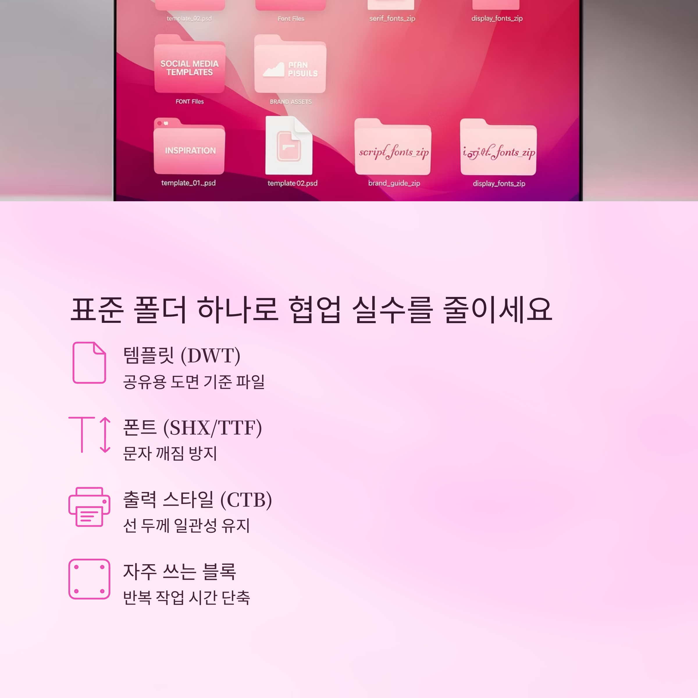 템플릿(DWT), 폰트(SHX/TTF), 출력 스타일(CTB), 자주 쓰는 블록을 한 폴더로 묶어두면 협업 도면에서 실수가 줄어듭니다.