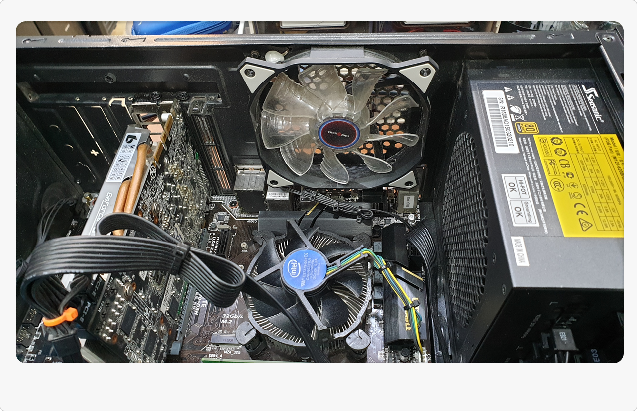 이후 손님이 본체를 직접 들고 오셨는데, 뜯어보니 전반적으로 깔끔하게 정돈된 상태였습니다. 다만, 과거에 ‘미원컴퓨터수리’ 사례로 접했던 것처럼 특정 메인보드 세대가 이미 단종된 부분이 눈에 띄더군요. 6세대 메인보드와 CPU를 사용하고 계셨는데, 이제는 시중에서 신품으로는 구하기가 쉽지 않은 부품이라 중고 거래를 통해서만 구할 수 있었습니다. 오래된 부품이라도 애정을 갖고 쓰는 분들이 계신 만큼, 저는 무조건 최신 시스템으로 갈아타라고 권하기보다는 고객님의 상황과 예산을 먼저 여쭤봅니다. 이번에도 “새 부품으로 교체하실 건지, 아니면 중고 부품으로 수리를 진행하실 건지”를 꼼꼼히 상담했답니다.