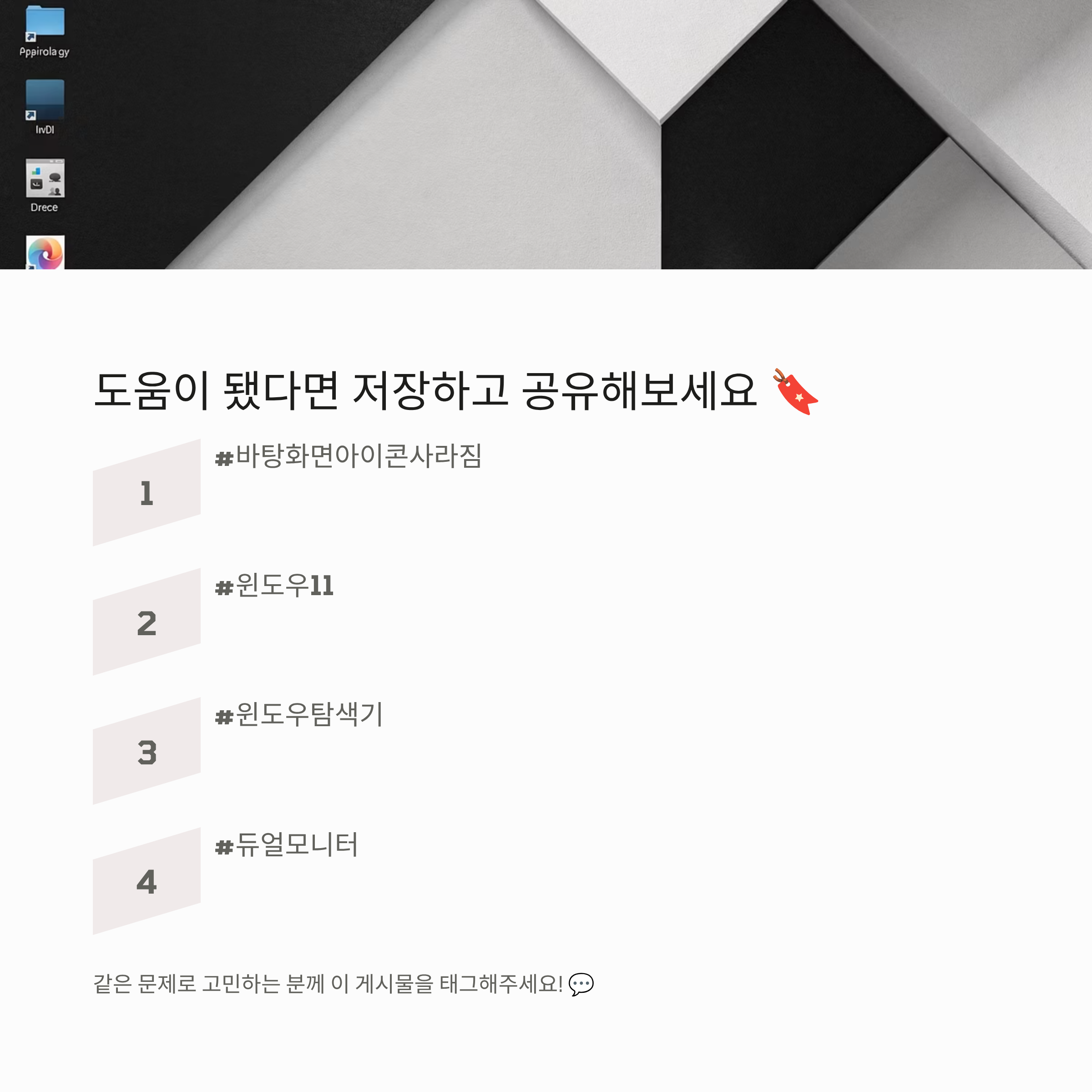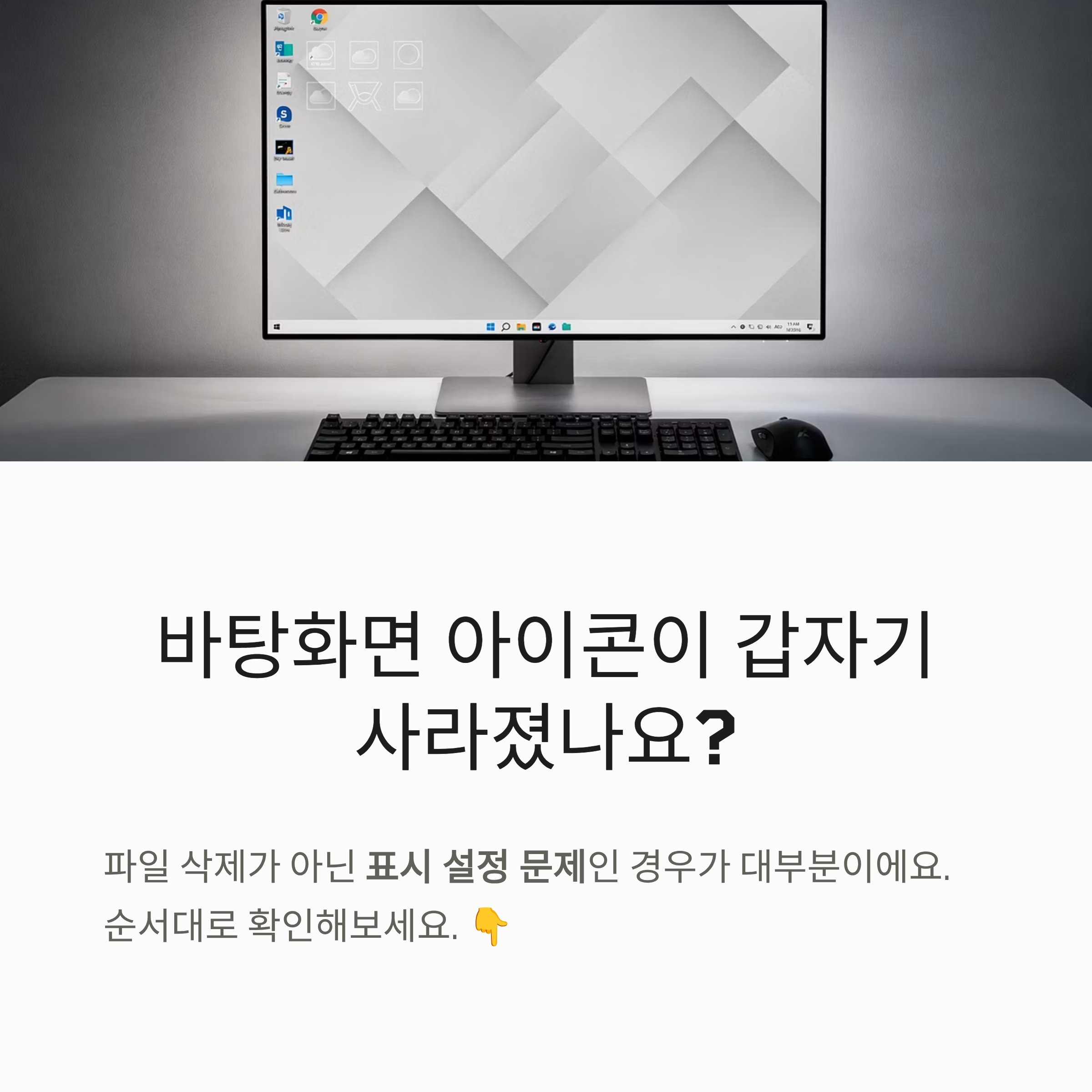 | 아이콘이 사라지면 파일도 삭제된 건가요? | 대부분은 표시 문제예요. ‘바탕화면 아이콘 표시’ 체크부터 확인해요. |