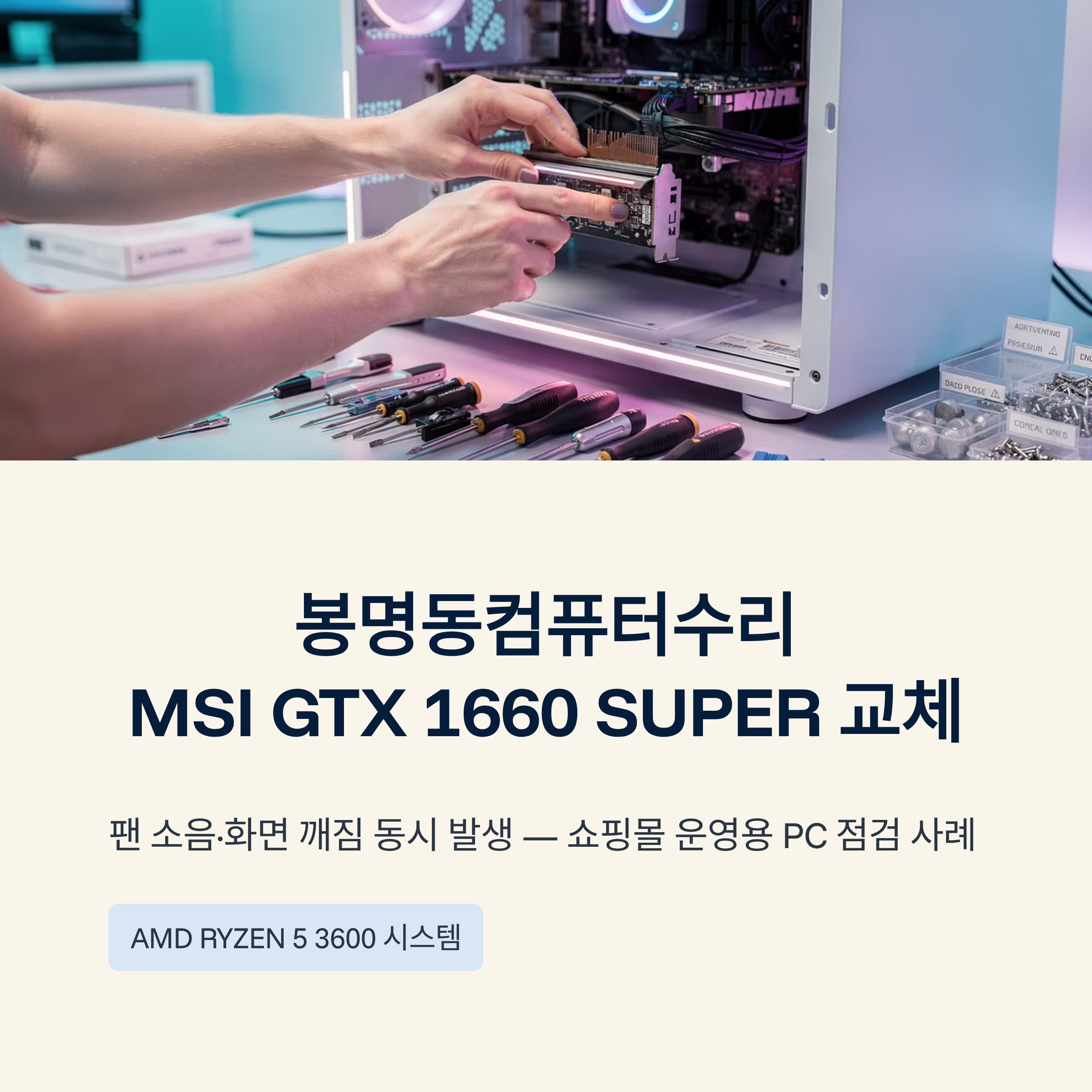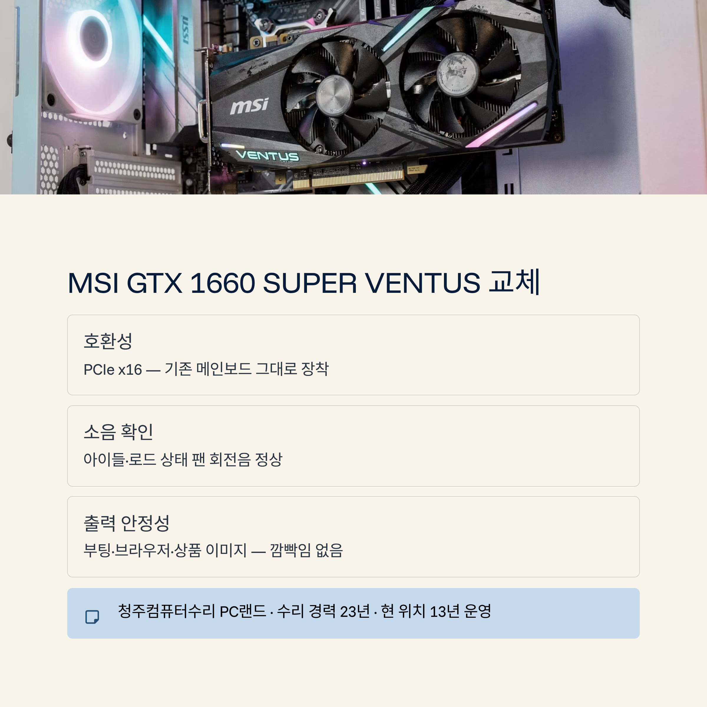 | 조치 내용 | 중고 MSI GTX 1660 SUPER VENTUS 장착, 소음·출력 안정 테스트 |