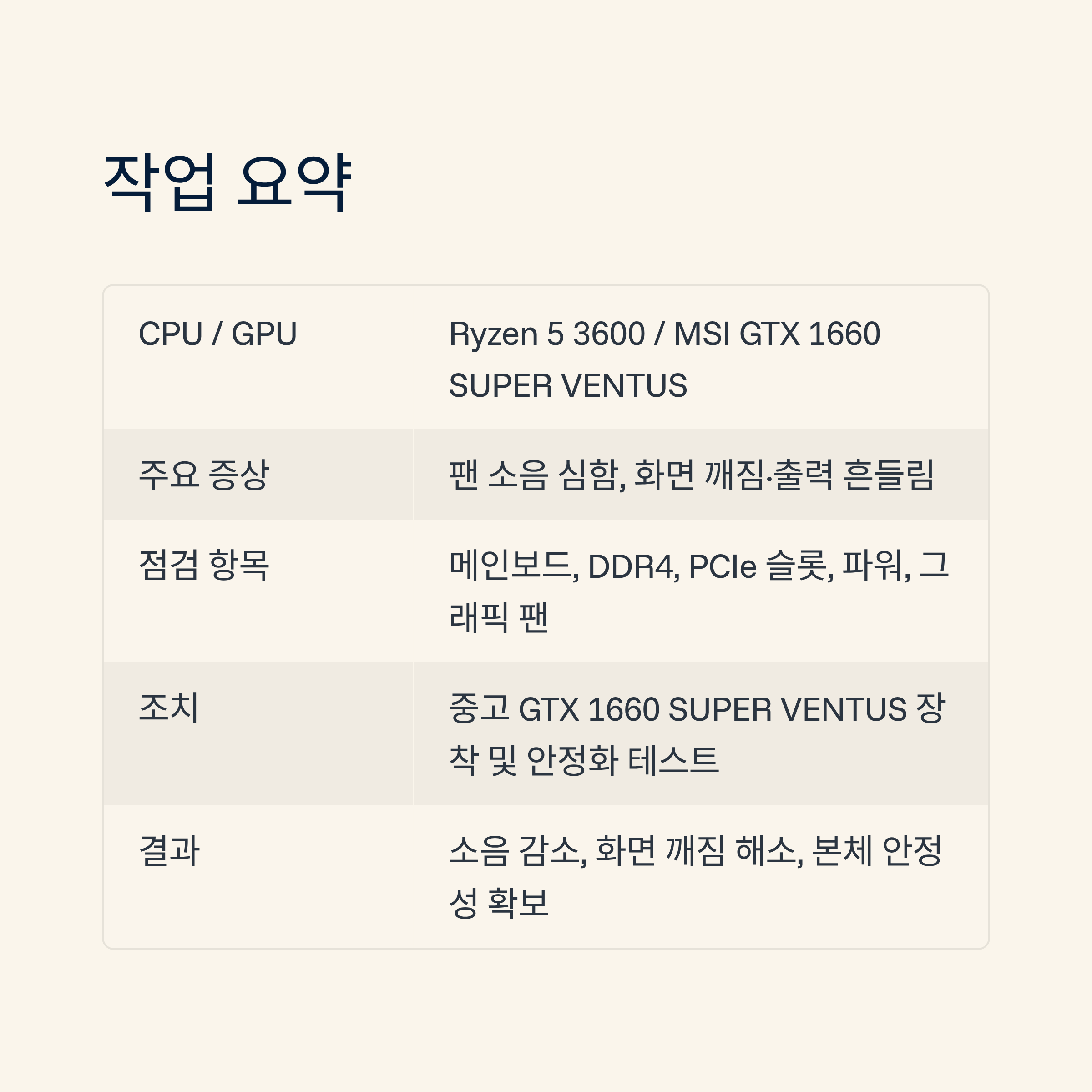 | 결과 요약 | 팬 소음 감소, 화면 깨짐 해소, 쇼핑몰 운영용 본체 안정성 확보 |