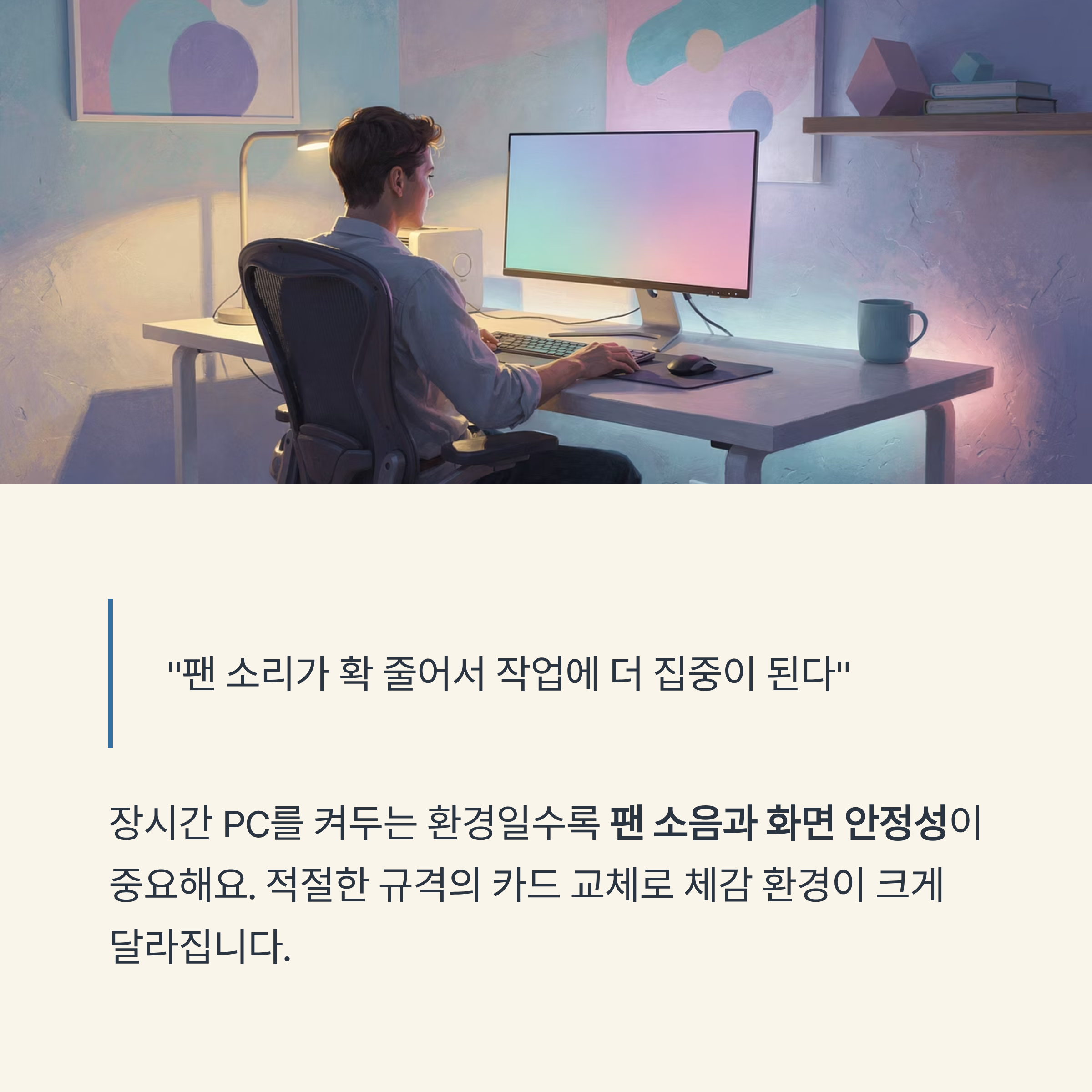 이번 사례처럼 그래픽카드 노후로 인한 팬 베어링 소음과 출력 문제는, 적절한 규격의 카드로 교체하면 체감 환경이 크게 달라질 수 있어요.