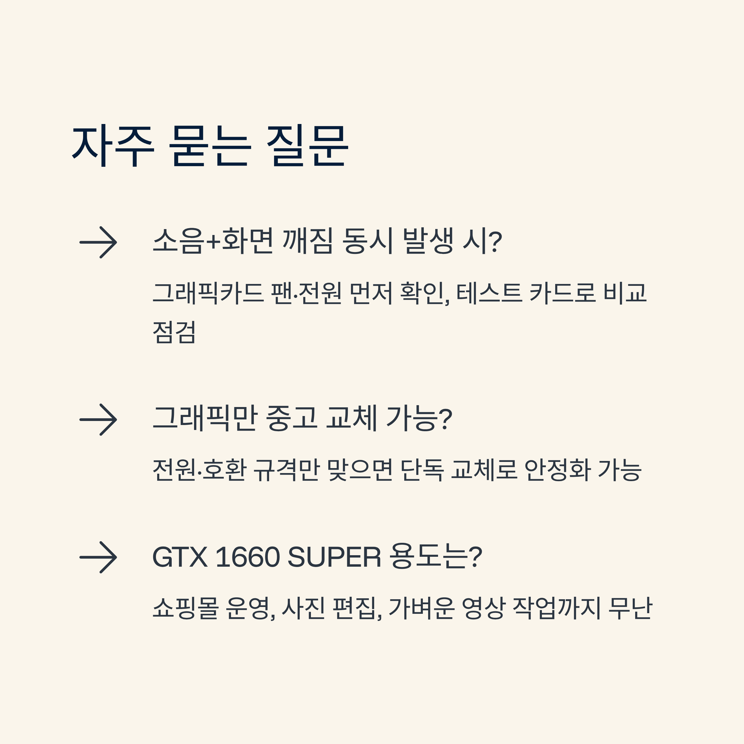 | Ryzen 5 3600 시스템에서 그래픽만 중고로 교체해도 되나요? | 전원과 호환 규격만 맞으면 그래픽 단독 교체로도 충분히 안정화가 가능해요. |