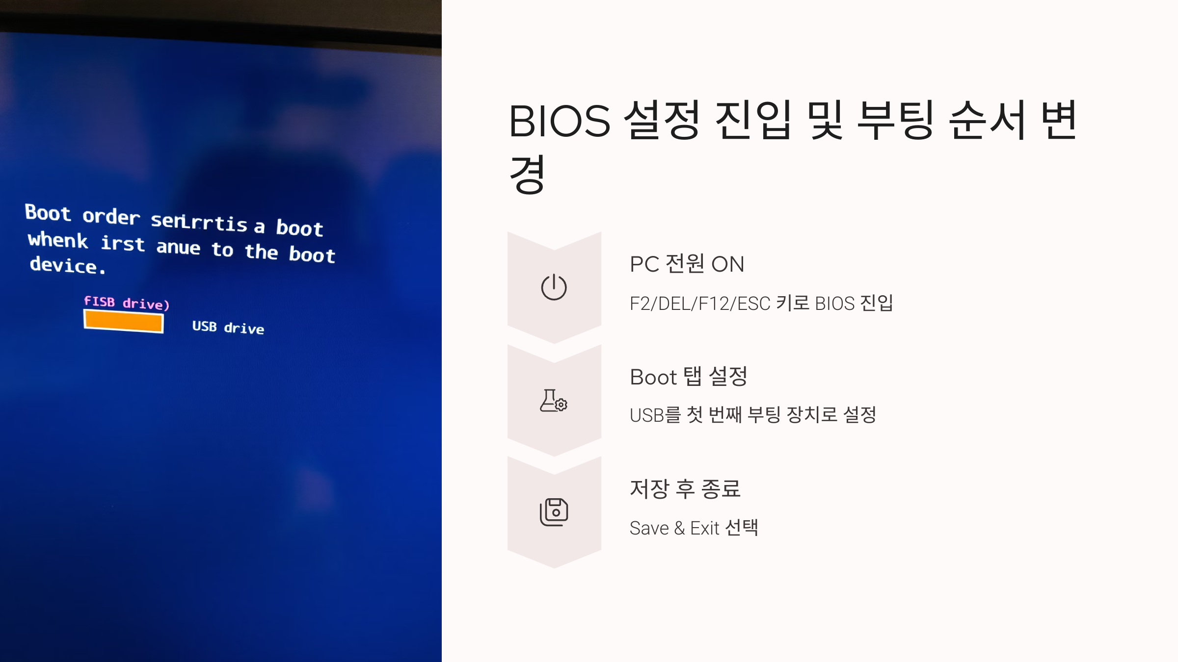 1. PC 전원 ON → F2 / DEL / F12 / ESC 중 메인보드에 따라 BIOS 진입 키 반복 입력