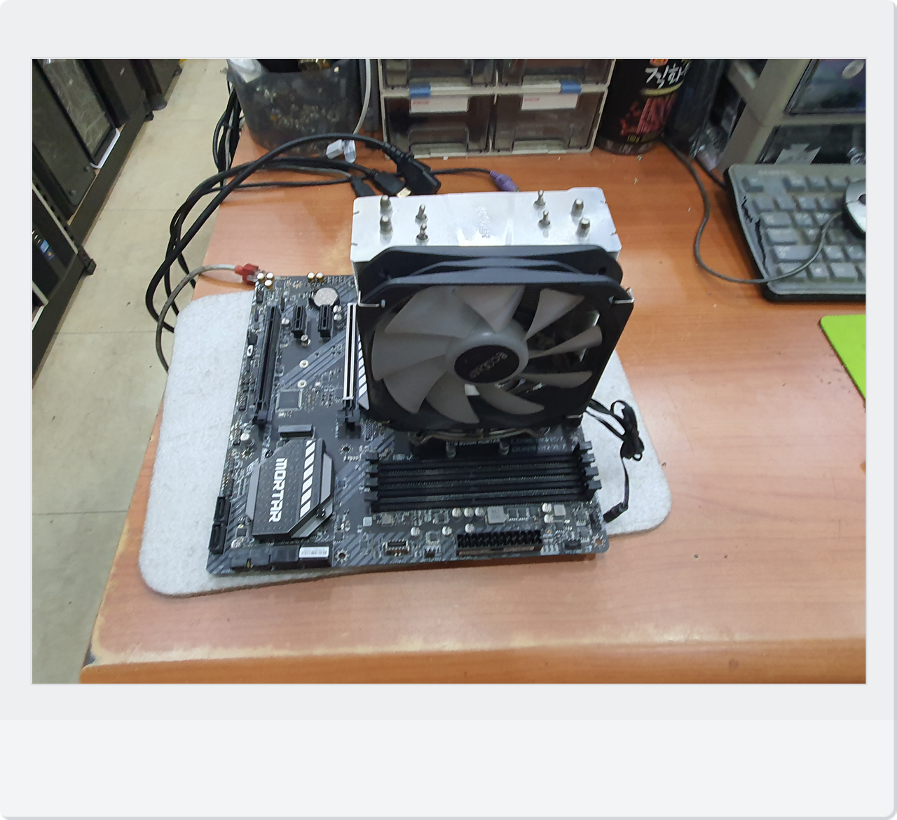 매장에 도착하자마자 제가 먼저 내부 부품을 하나씩 점검해봤습니다. 혹시나 CPU나 메모리 슬롯이 흔들렸는지, 그래픽카드가 먼지 때문에 접촉 불량을 일으키는 건 아닌지 차근차근 살폈어요. 그런데 별다른 문제점이 보이지 않아서 “메인보드에서 이상이 생긴 게 아닐까?” 하는 생각이 들었지요. 실제로 전원을 켜면 팬은 도는데 메인보드 상태 표시등이 정상적으로 반응하지 않았습니다. 그래서 테스트 장비를 이용해 본체와 별도로 메인보드만 따로 구동해 보니, 역시나 신호가 잡히지 않았습니다.