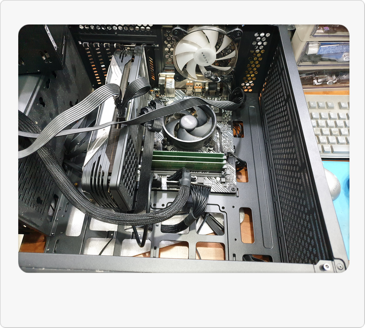 우선 본체를 열어 내부를 살펴보니, 생각보다 먼지가 꽤 쌓여 있었습니다. 오래 사용하면 어쩔 수 없이 내부에 이물질이 생기기 마련인데, 이게 잘못하면 열 배출에 영향을 주거나 부품 손상의 원인이 되기도 해요. 손님께서는 매번 외관만 살짝 닦아주셨다는데, 적어도 1년에 한 번쯤은 케이스 내부 점검이 필요하다고 설명드렸습니다. 그래도 다행인 건, 다른 부품들은 큰 문제 없이 잘 버티고 있었어요. 오랜 기간 사용한 만큼 구형이긴 하지만, 의외로 튼튼하다고 느껴지더라고요. 제가 다시 봐도 ‘역시 예전 제품들이 내구성이 좋긴 하구나’라는 생각이 들었습니다.