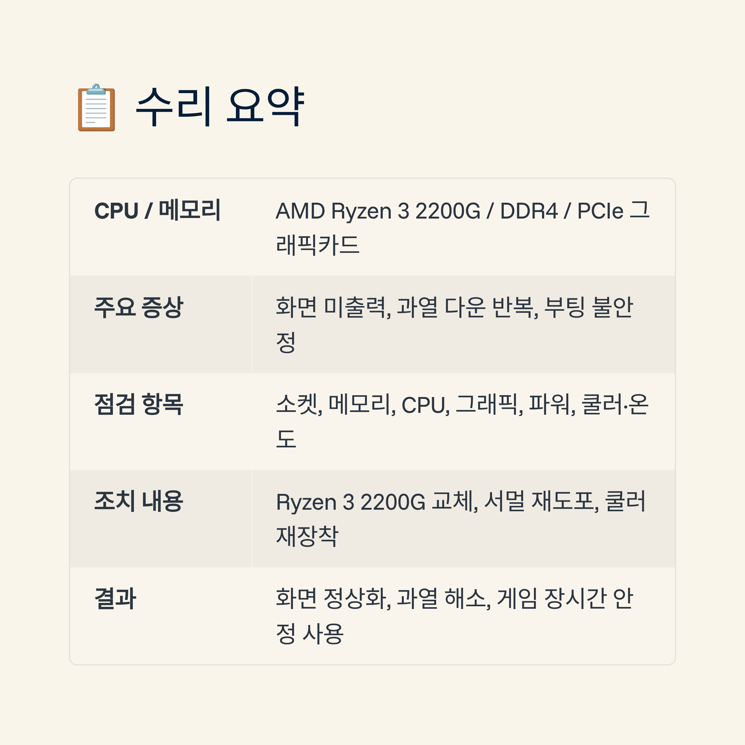 | 결과 요약 | 화면 출력 정상화, 과열 해소, 게임 실행 및 장시간 사용 시 안정성 확보 |