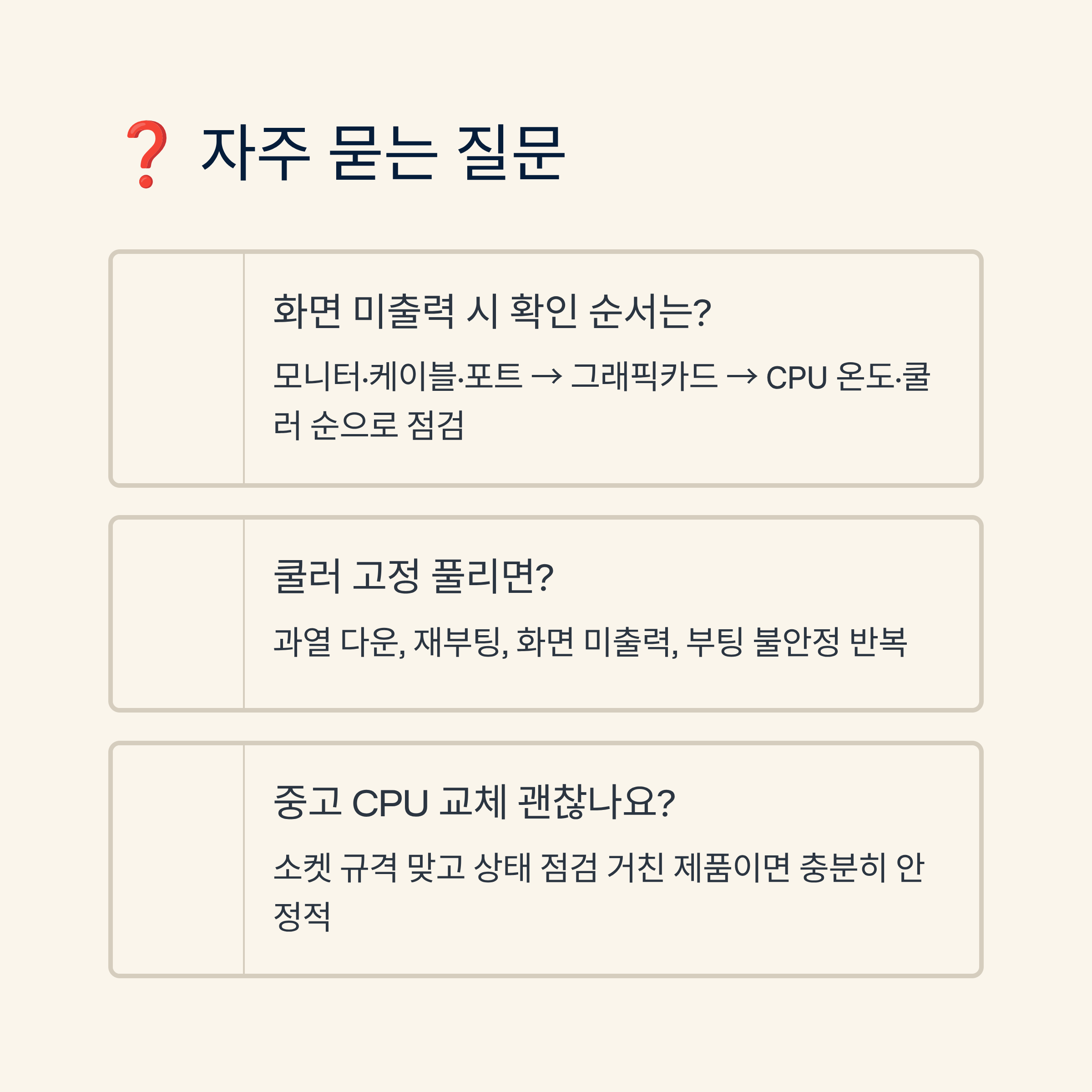 | CPU 쿨러 고정이 풀리면 어떤 증상이 생길 수 있나요? | 과열로 인한 다운, 재부팅, 화면 미출력, 부팅 불안정 같은 증상이 반복될 수 있어요. |