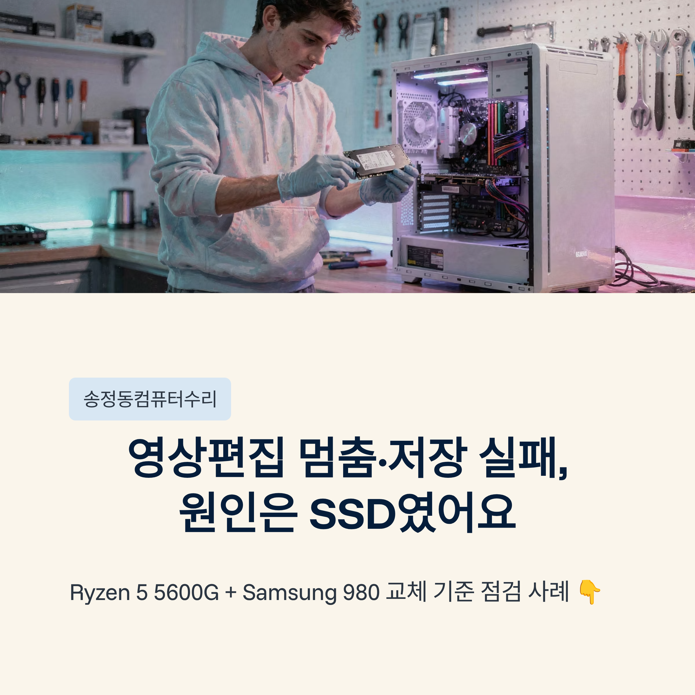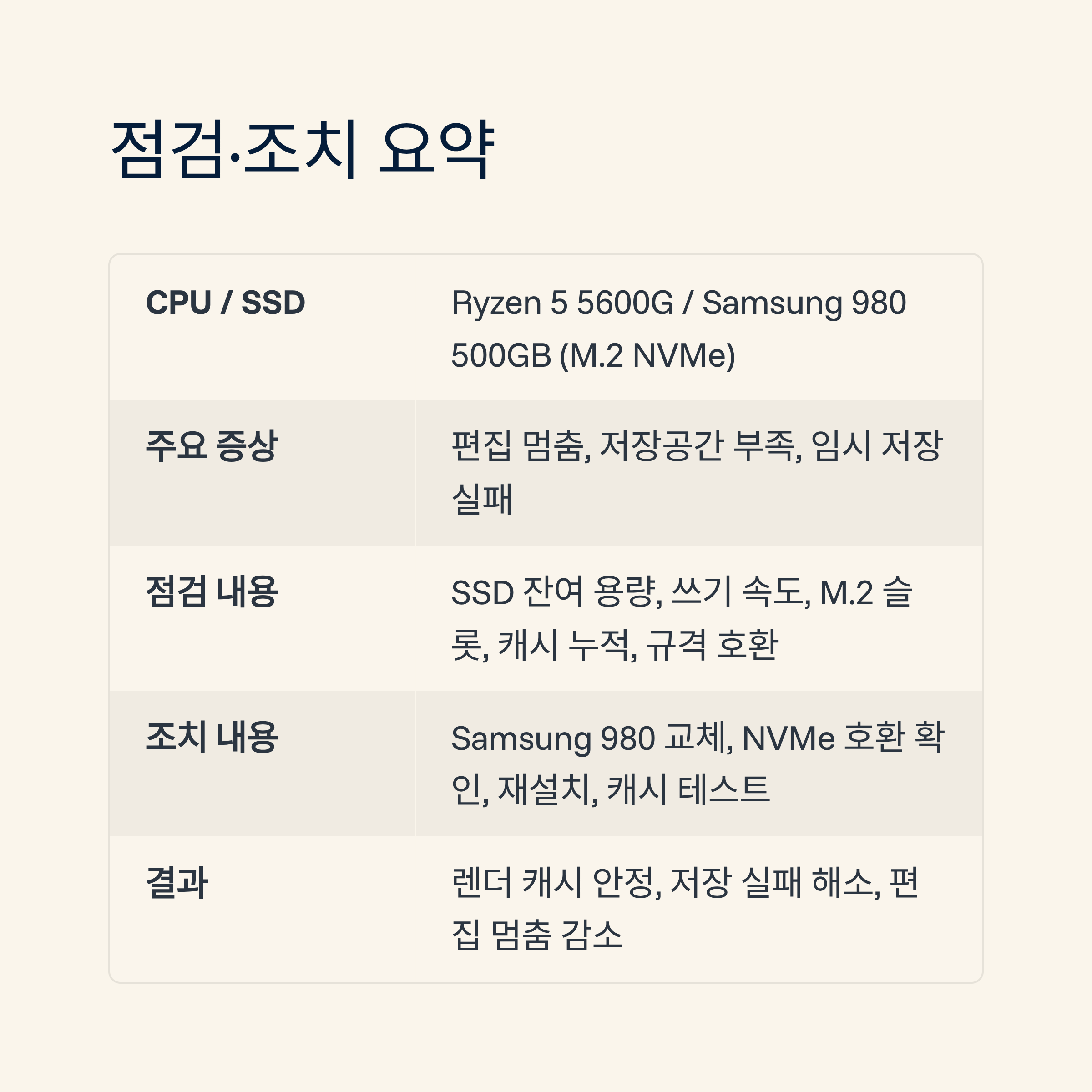| 핵심 개념 | 영상편집 멈춤·저장 실패 원인 분리 + SSD 교체 |