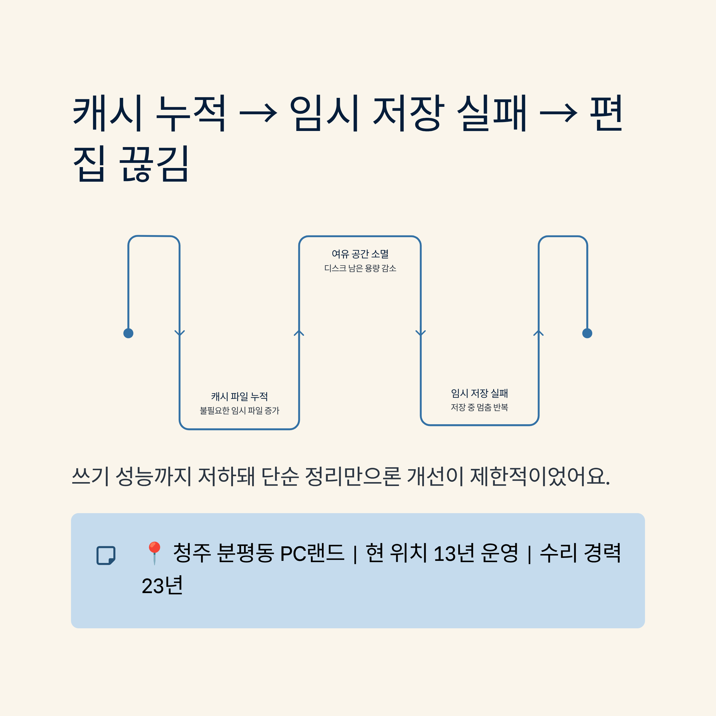 이번 케이스의 핵심은 캐시 파일이 계속 쌓이면서 여유 공간이 사라졌고, 그 결과 임시 저장이 실패하던 흐름이에요.