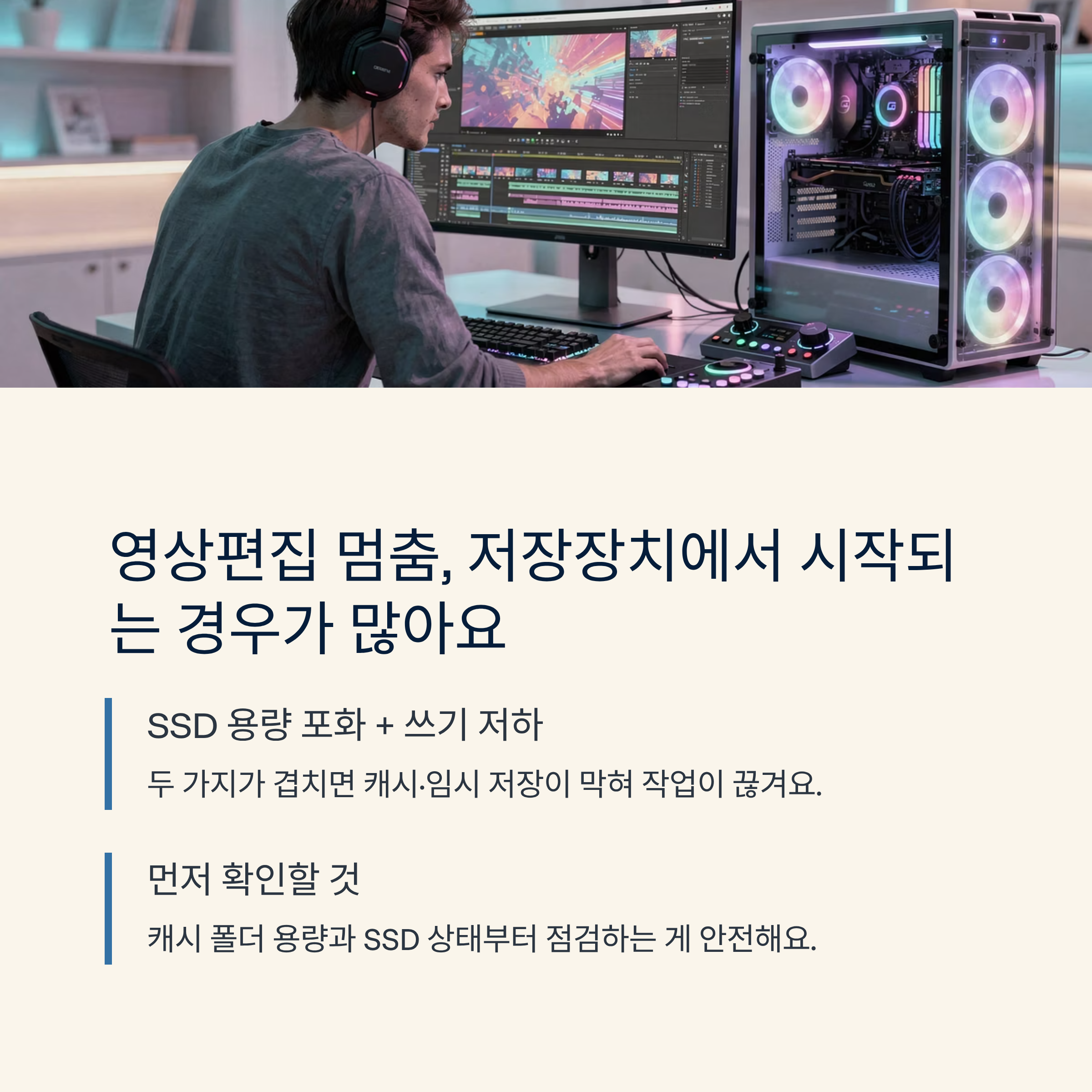 영상편집 PC는 “프로그램이 멈추는 이유”가 생각보다 저장장치에서 시작되는 경우가 많아요.