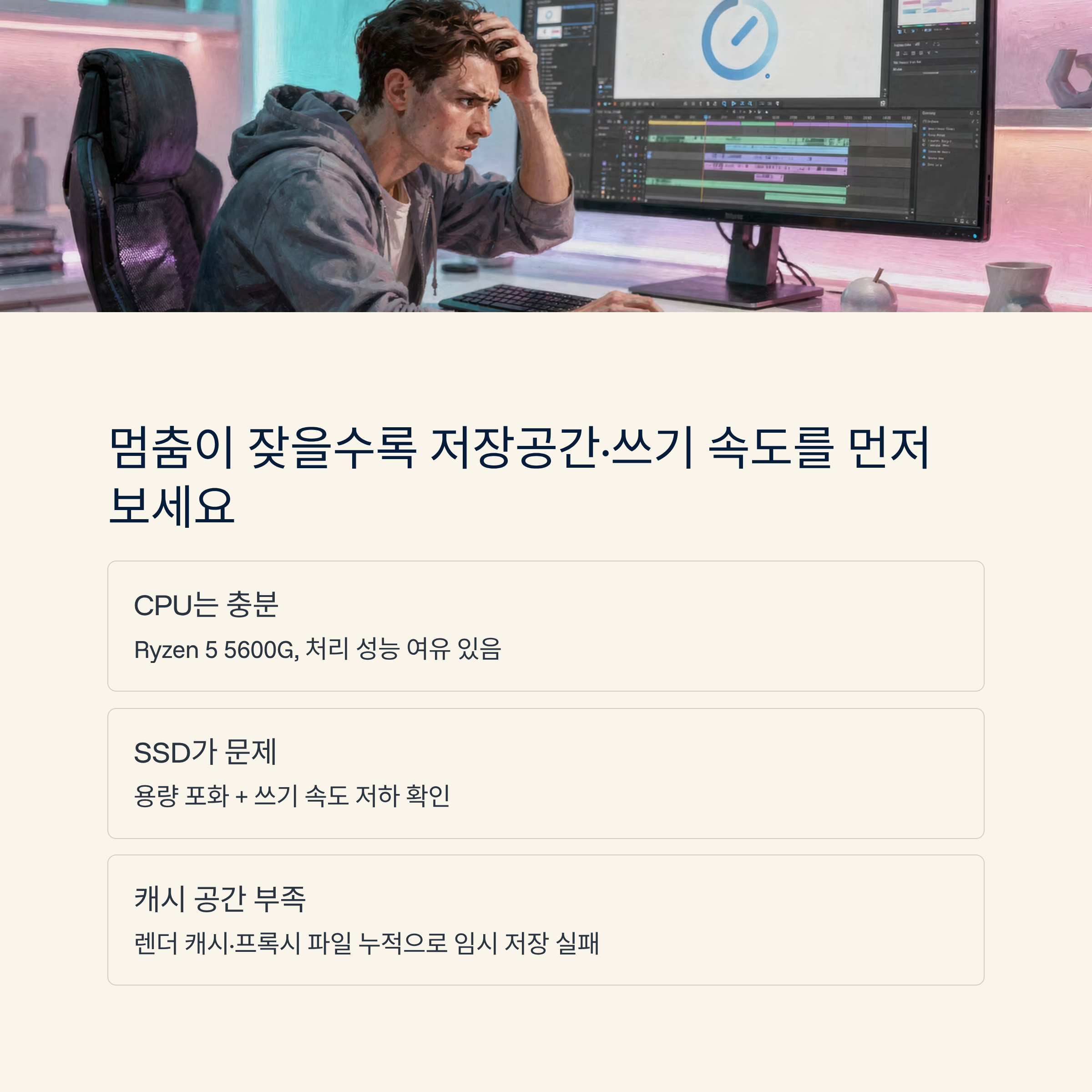 편집 프로그램은 렌더 캐시와 프록시 파일이 계속 쌓이는데, 그 공간이 부족하면 임시 저장이 실패하면서 멈춤으로 이어질 수 있네요.