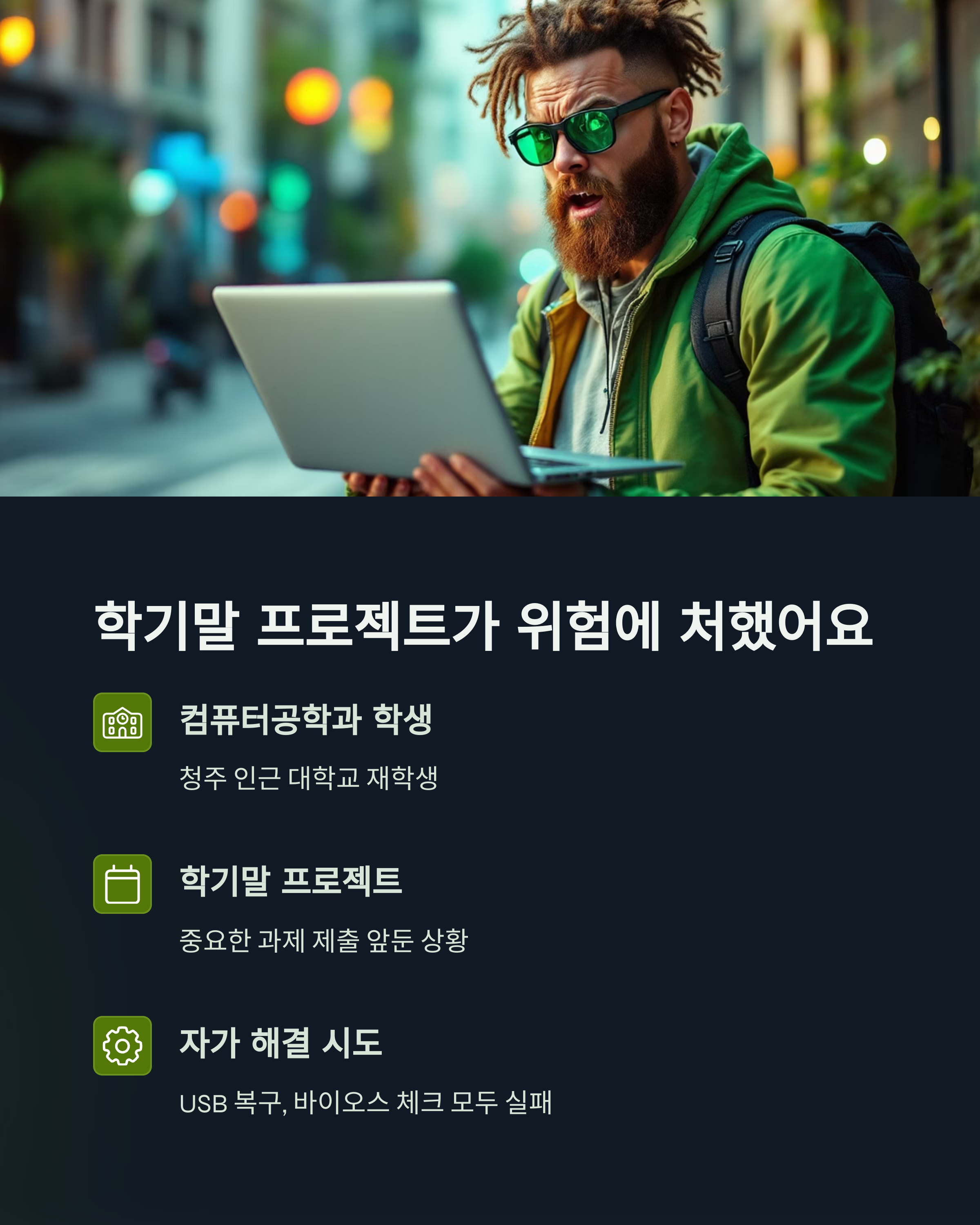 학기말 프로젝트 제출을 앞두고 컴퓨터가 말썽을 부린 상황이었어요.