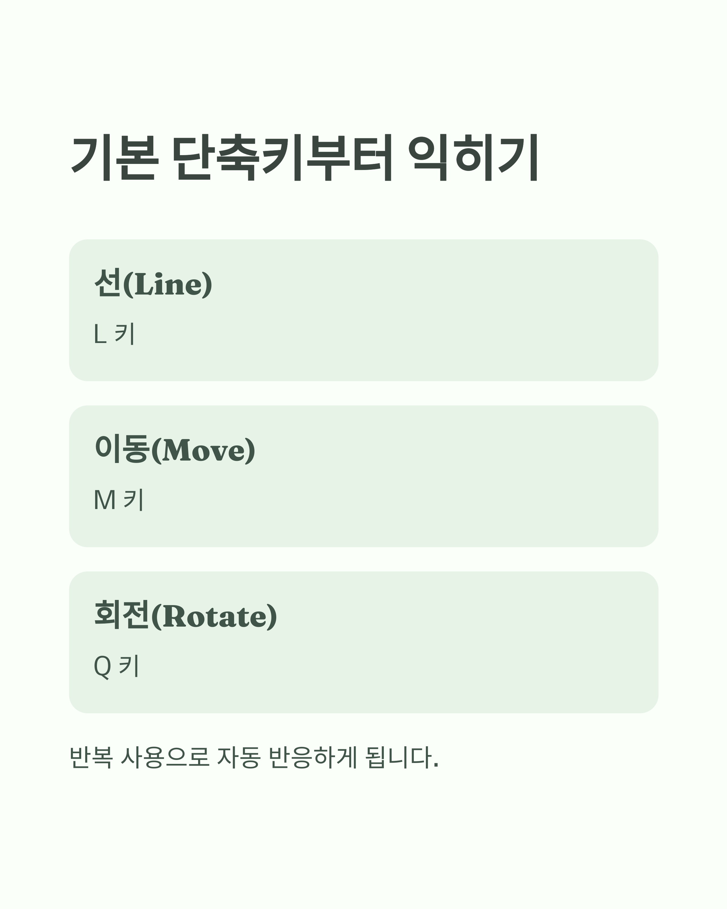 무작정 아무 키나 쓰다 보면 기억하기 어려워져요. 그래서 자신만의 규칙을 정해두면 훨씬 편해져요. 예를 들어 Shift 조합은 보기 기능, Alt 조합은 그룹 관련, Ctrl 조합은 편집 기능 이런 식으로요.