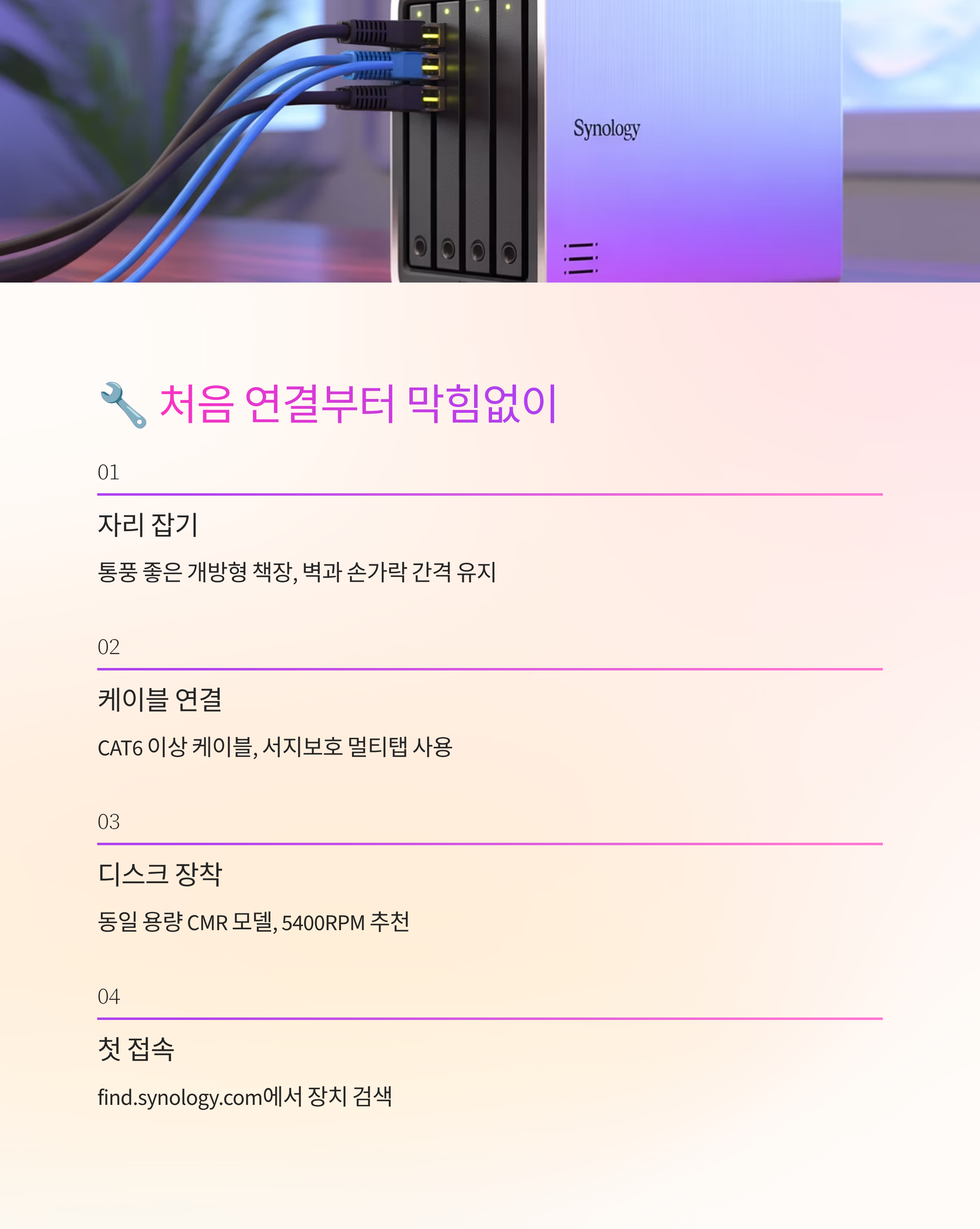 처음 나스를 들이시면 어디부터 손대야 할지 막막하시죠. 전원 넣고 케이블 꽂았는데도 화면이 안 보이거나, 용어가 낯설어서 메뉴만 빙빙 돌 때가 은근히 많더라고요. 걱정하지 마세요, 생각보다 순서만 잡아두면 금방 자리 잡아요. 오늘은 박스 개봉부터 첫 백업까지, 꼭 필요한 흐름만 콕 집어 정리해볼게요. 모르면 헷갈릴 수밖에 없는 부분을 실전 기준으로 풀어가니, 따라만 오셔도 세팅이 술술 끝나요. 그럼 하나씩 차근차근 같이 시작해볼까요?