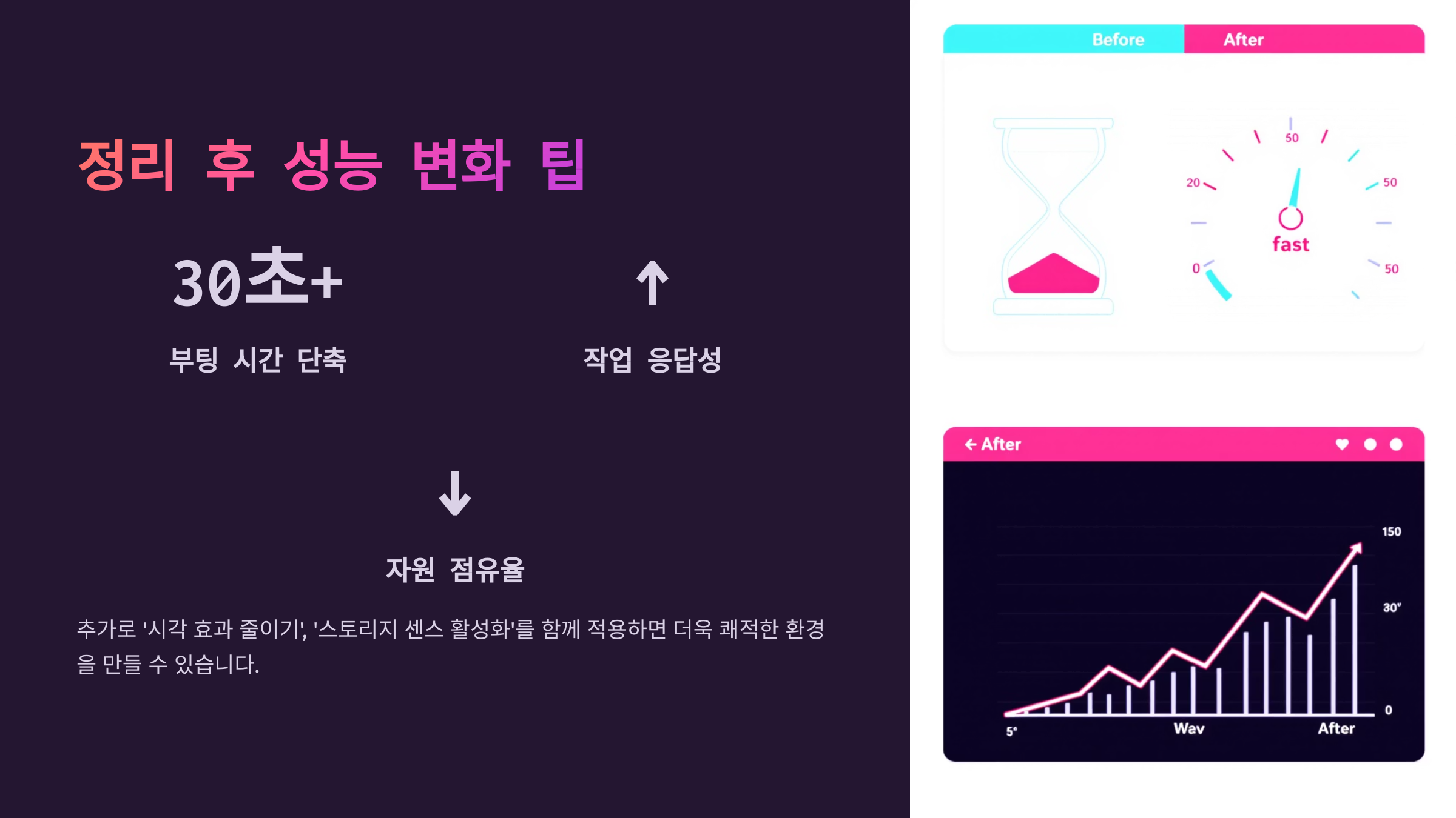 💡 추가로 '시각 효과 줄이기', '스토리지 센스 활성화'를 함께 적용하면 더욱 쾌적한 환경을 만들 수 있습니다.