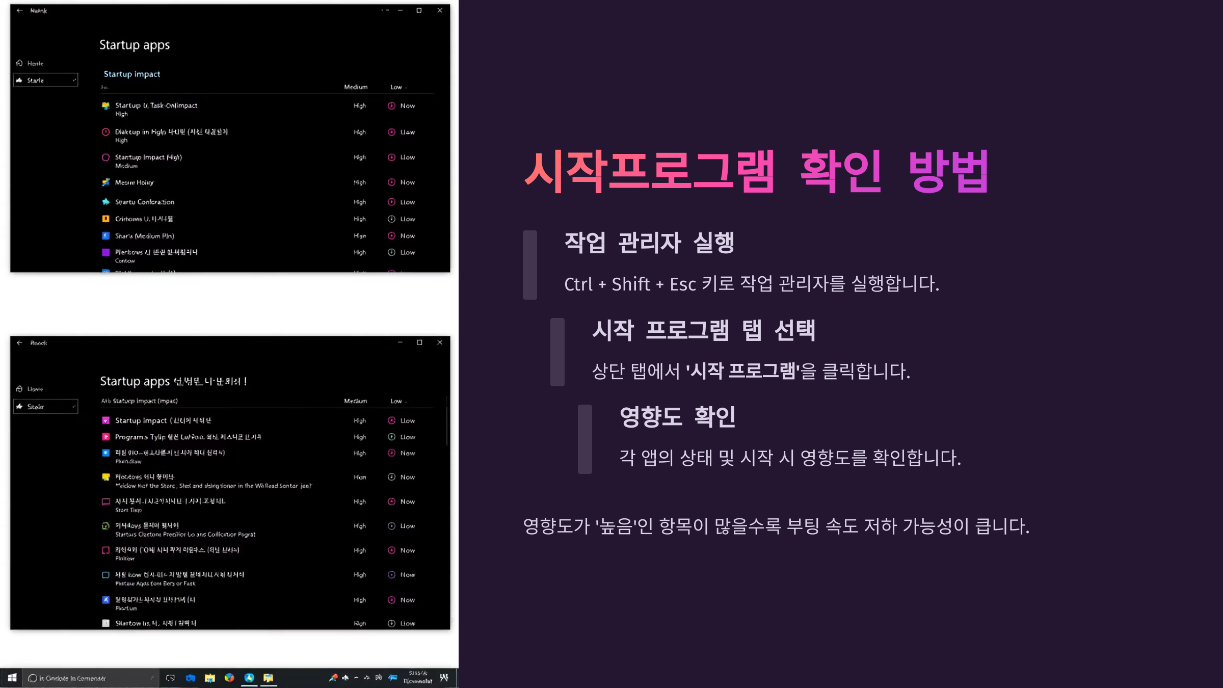영향도가 '높음'인 항목이 많을수록 부팅 속도 저하 가능성이 큽니다.