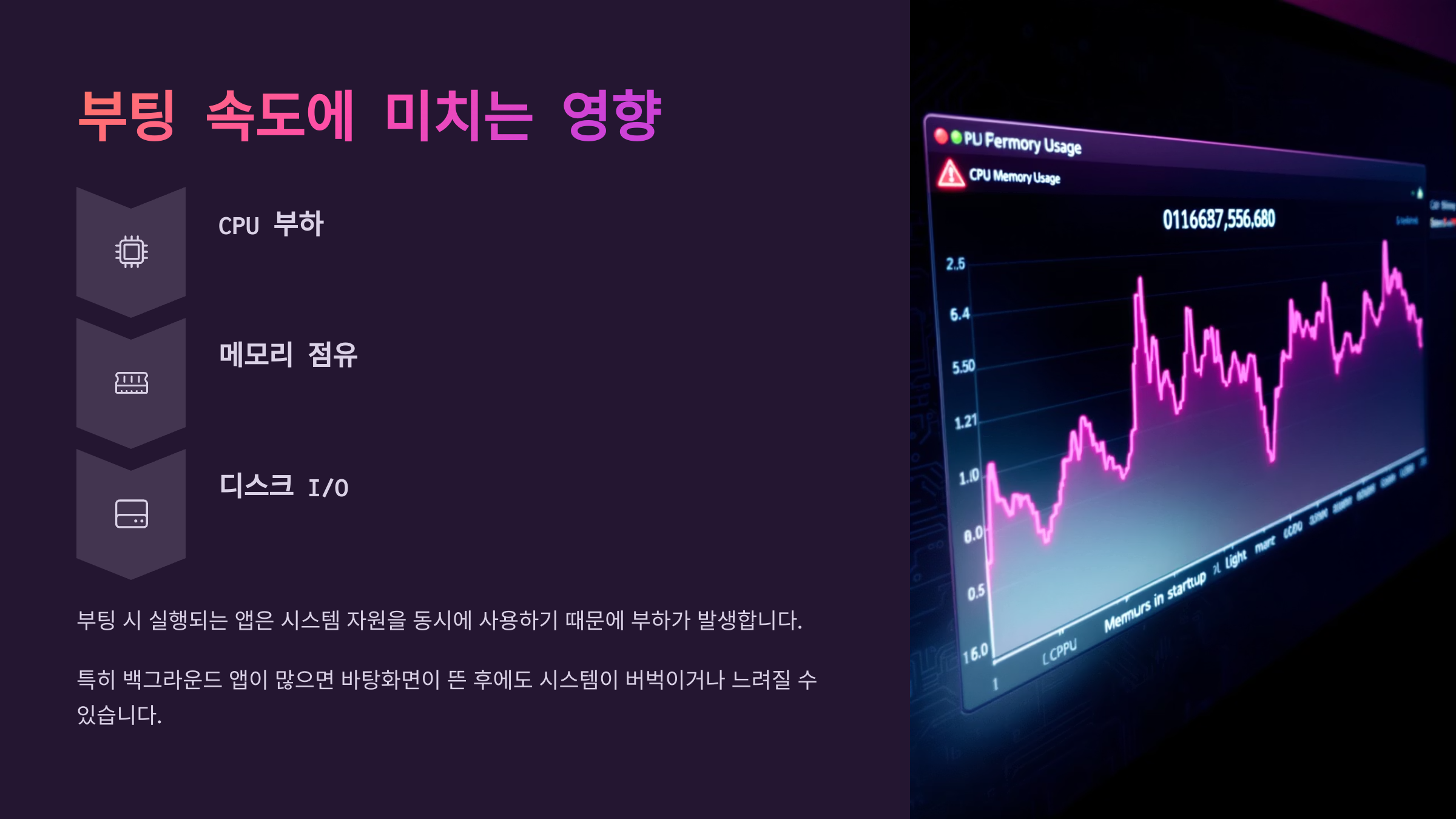 부팅 시 실행되는 앱은 CPU, 메모리, 디스크 I/O를 동시에 사용하기 때문에 부하가 발생합니다. 특히 백그라운드 앱이 많으면 바탕화면이 뜬 후에도 시스템이 버벅이거나 느려질 수 있습니다.