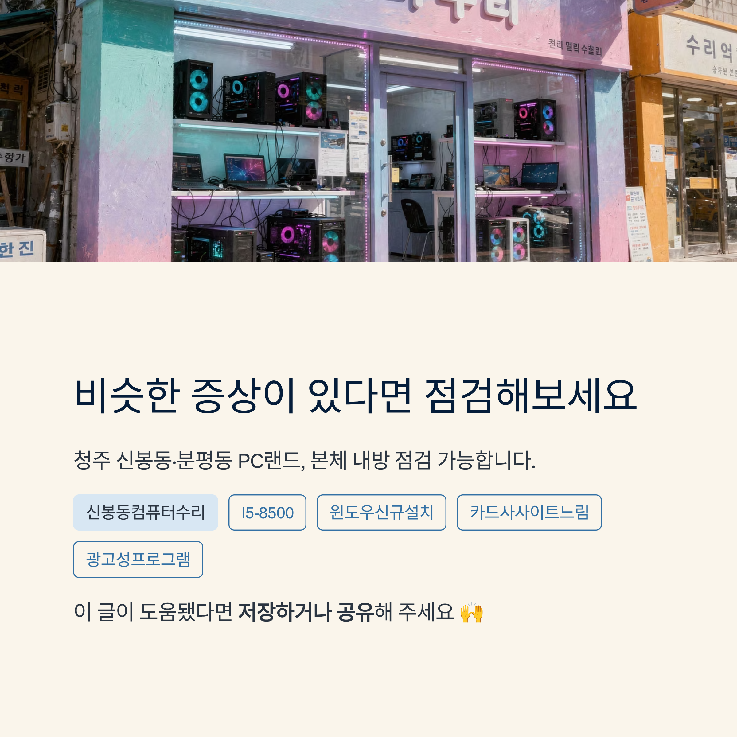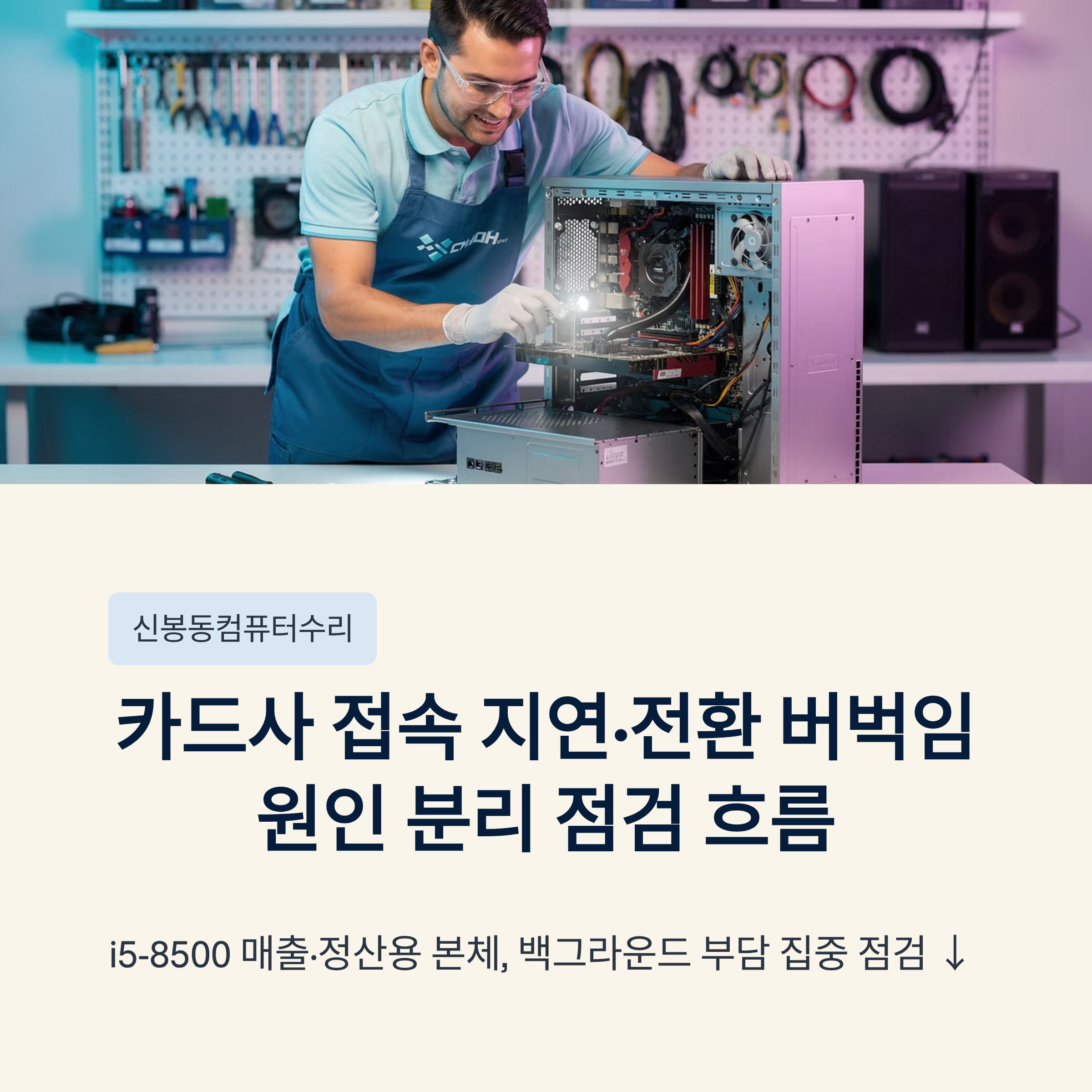 이번 건은 신봉동컴퓨터수리로 매출·정산용 본체를 내방하셔서, 접속 지연과 전환 버벅임 원인을 먼저 분리 점검했어요.