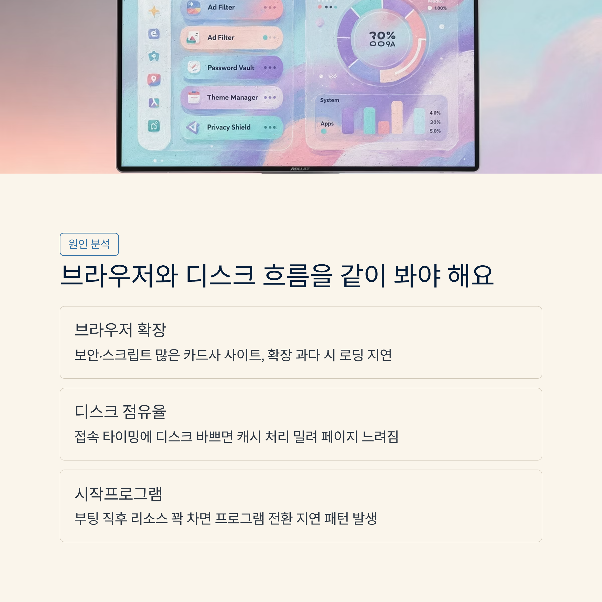 💳 사이트 접속이 느리면 브라우저와 디스크 흐름을 같이 봐야 해요