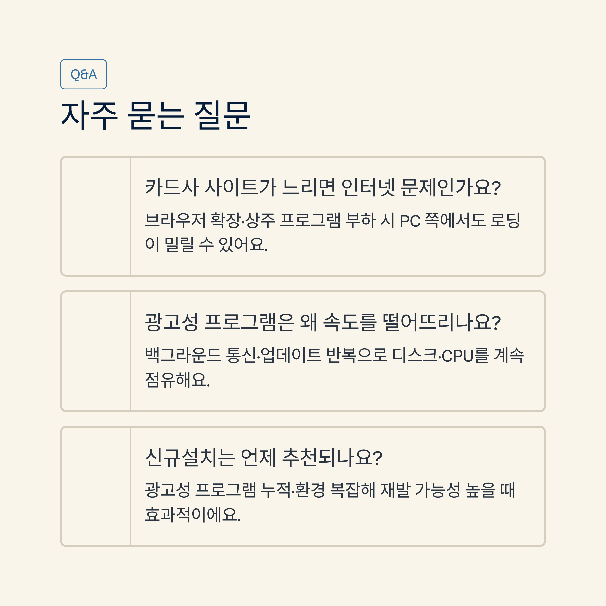 | 카드사 사이트가 느리면 인터넷 문제인가요? | 브라우저 확장·상주 프로그램 부하가 있으면 PC 쪽에서도 로딩이 밀릴 수 있어요. |