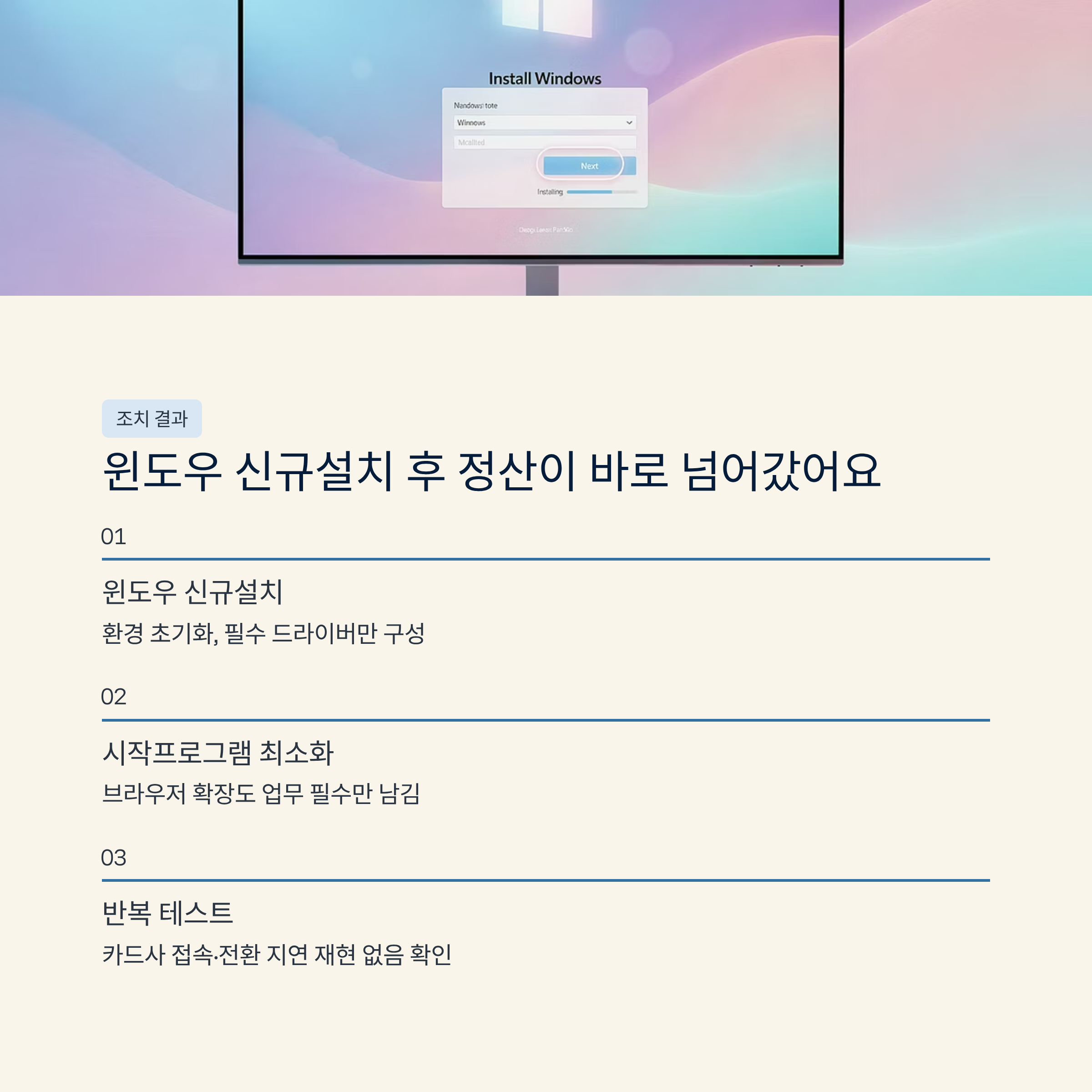 그 다음 카드사 사이트 접속과 프로그램 전환을 반복 테스트해, 지연이 재현되지 않는지 확인했네요.
