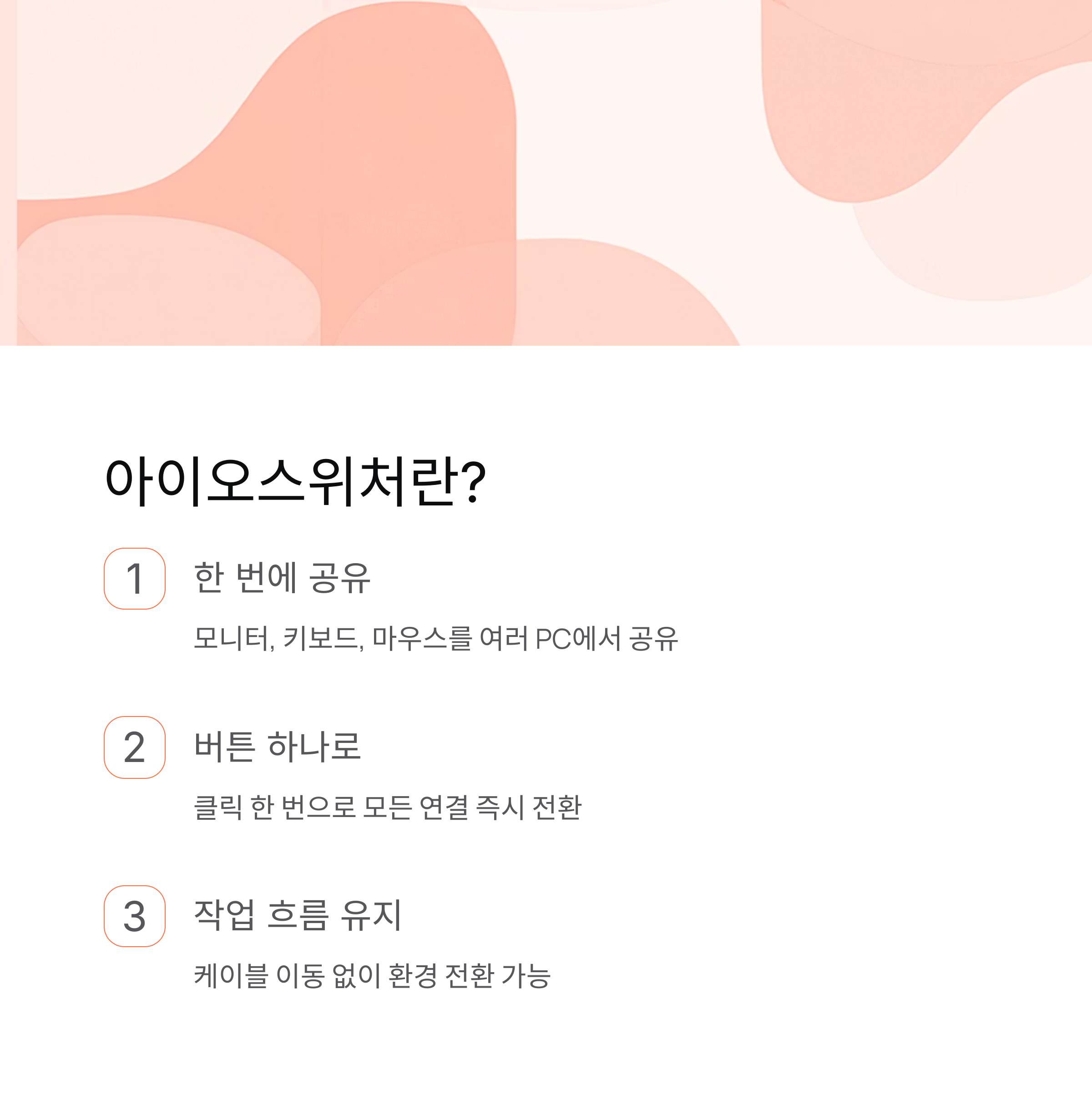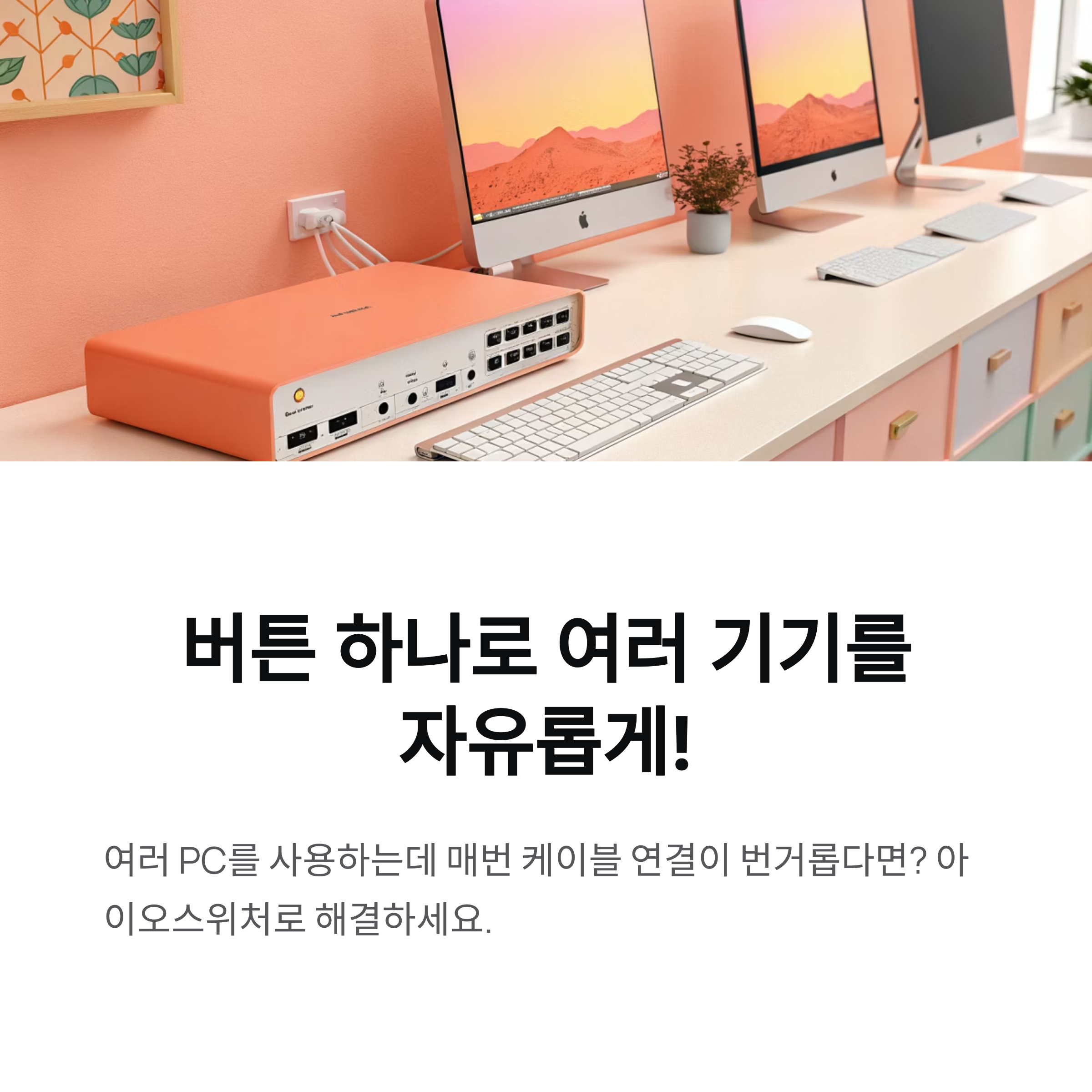 실제로 아이오스위처를 사용하면 버튼 클릭 한 번으로 모든 연결이 즉시 전환되어, 작업 흐름이 끊기지 않고 자연스럽게 이어졌어요. 물리적인 케이블 이동 없이도 환경을 바꿀 수 있다는 점은 생각보다 큰 차이를 만들더라고요.