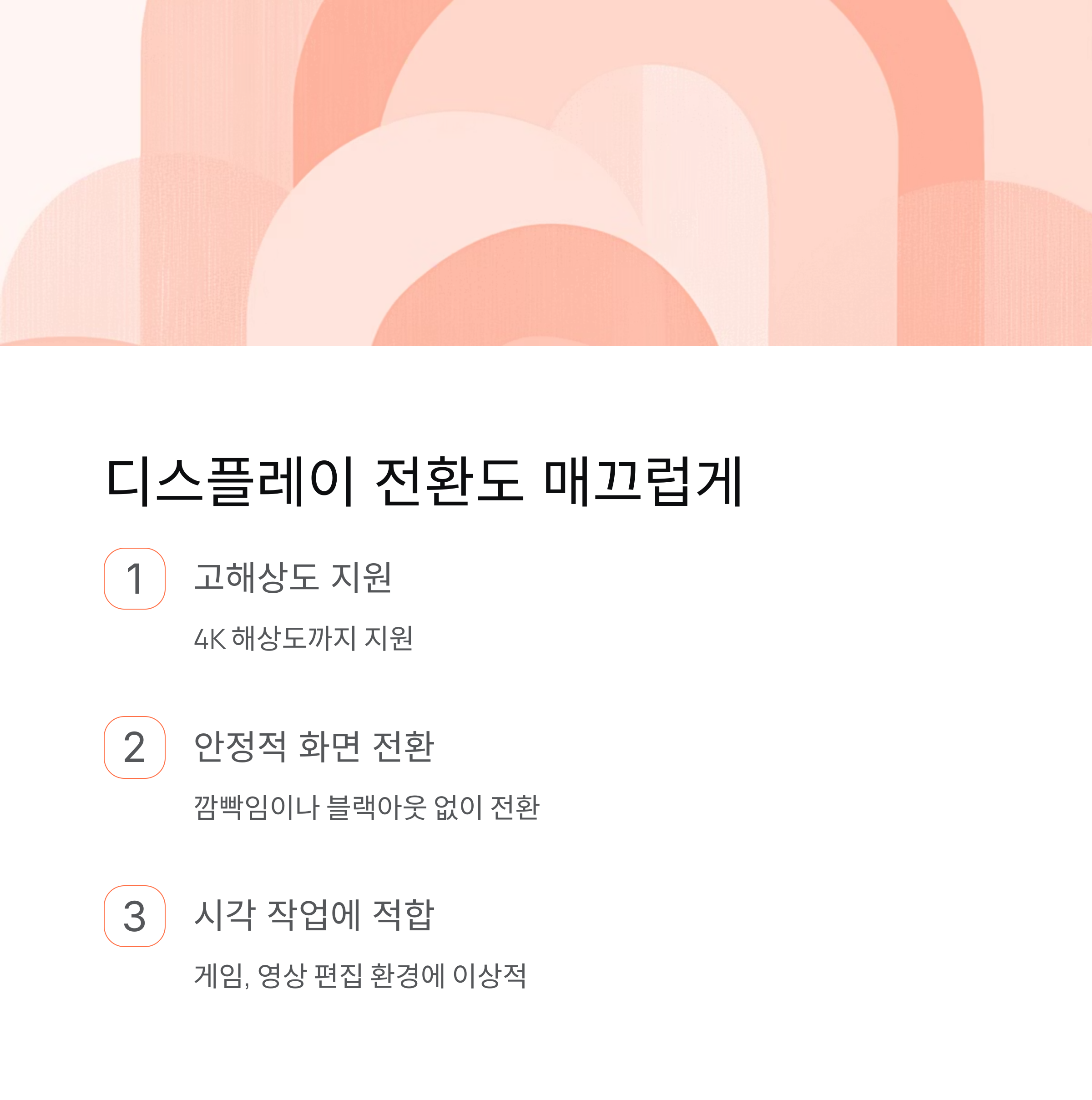 모니터가 한 대뿐인데 여러 대의 PC를 연결해 사용하고 싶을 때, 이 제품은 정말 요긴했어요. 전환 시 딜레이가 거의 없고, 화면 해상도나 비율도 그대로 유지되기 때문에 모니터를 자주 바꾸는 사용자에게도 유리했어요.