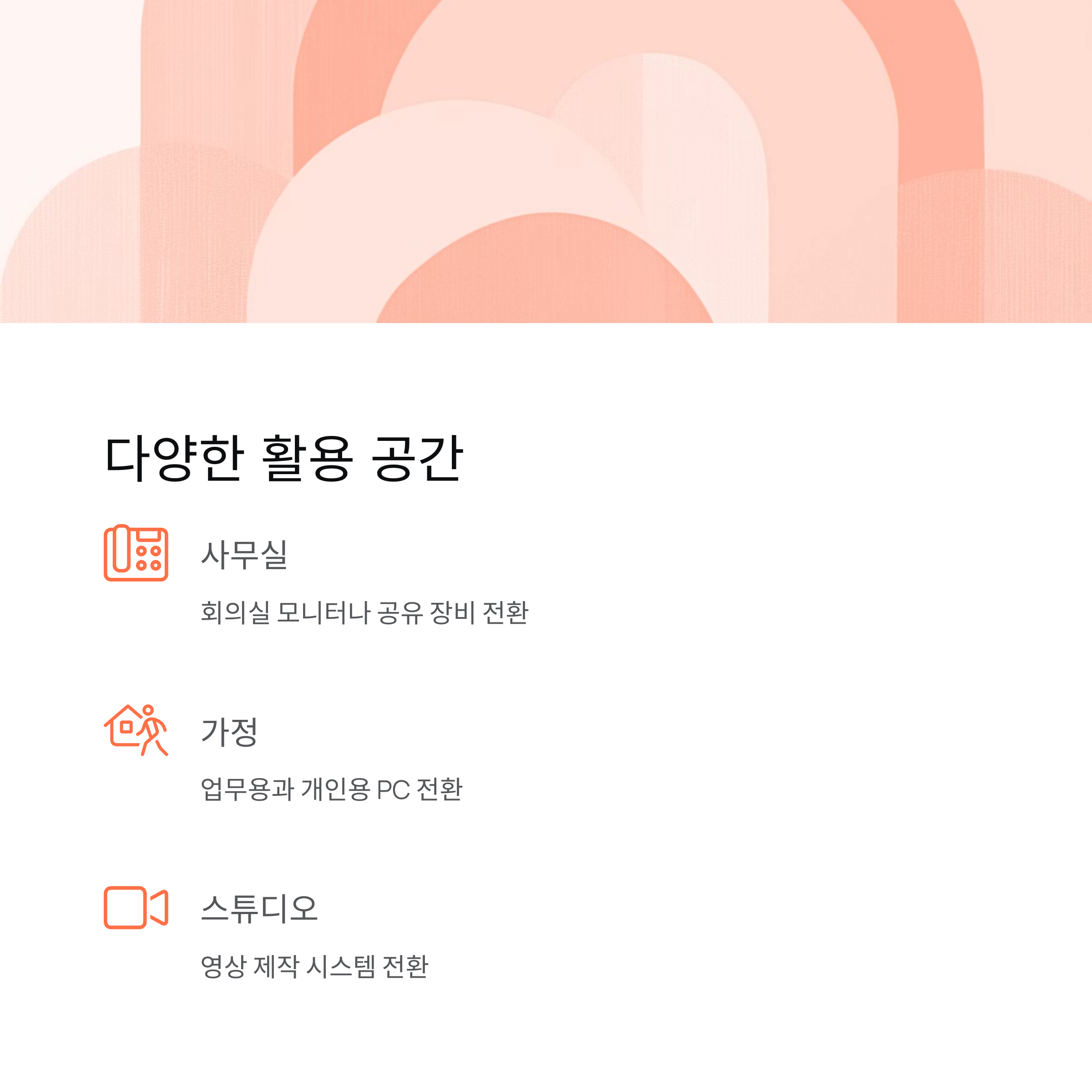 작지만 일상에서 꽤 큰 변화를 만들어주는 장비가 바로 이런 제품들이 아닐까 싶어요. 여러 대의 장비를 사용하는 환경에서 효율적으로 전환할 수 있도록 도와주는 이 제품은, 실제로 사용해보면 그 편리함이 더 크게 느껴지실 거예요. 복잡한 설정 없이도 업무와 일상을 더 편하게 만들어주는 선택지로, 꼭 한 번 체험해보셨으면 좋겠어요.