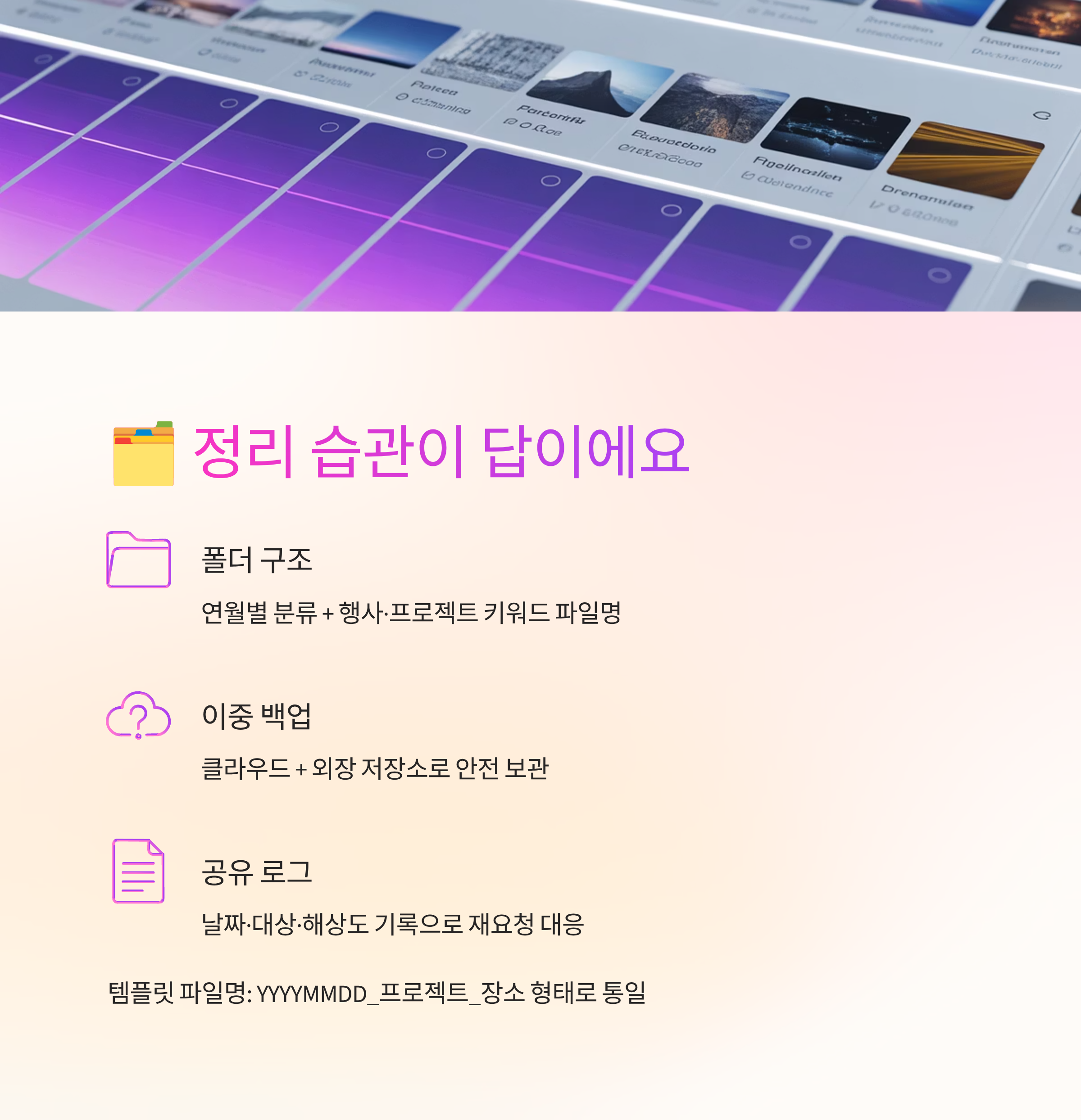 연월별 폴더로 나누고, 행사·프로젝트 키워드를 파일명에 붙이면 검색이 빨라져요. 같은 장면은 베스트 컷만 남기고 나머진 아카이브로 보내면 라이브러리가 가벼워져요. 백업은 클라우드와 외장 저장소를 이중으로 두면 안심이에요.