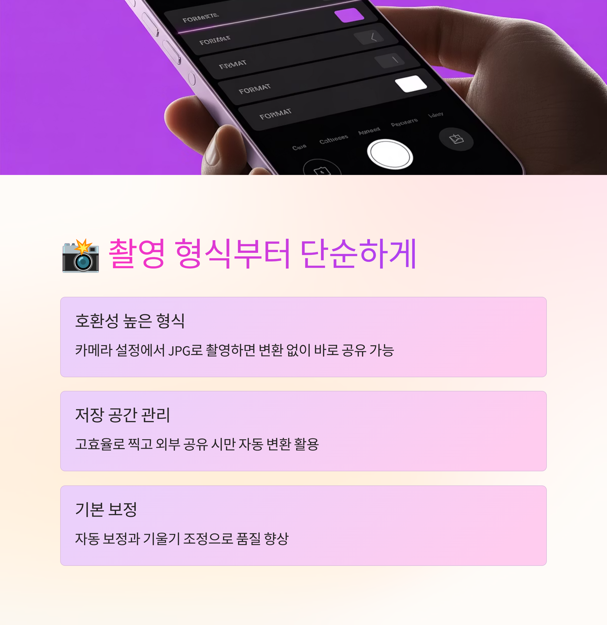 가장 쉬운 방법은 애초에 JPG로 찍는 거예요. 카메라 설정에서 고효율 대신 가장 호환성 높은 형식을 고르면, 이후 변환 없이 바로 공유가 가능해요. 클라우드나 메신저에서도 썸네일이 즉시 뜨고, 인쇄소에 넘길 때도 별도 작업이 필요 없어요. 이렇게 시작을 바꿔두면 아이폰JPG변환 고민이 절반은 줄어들어요.