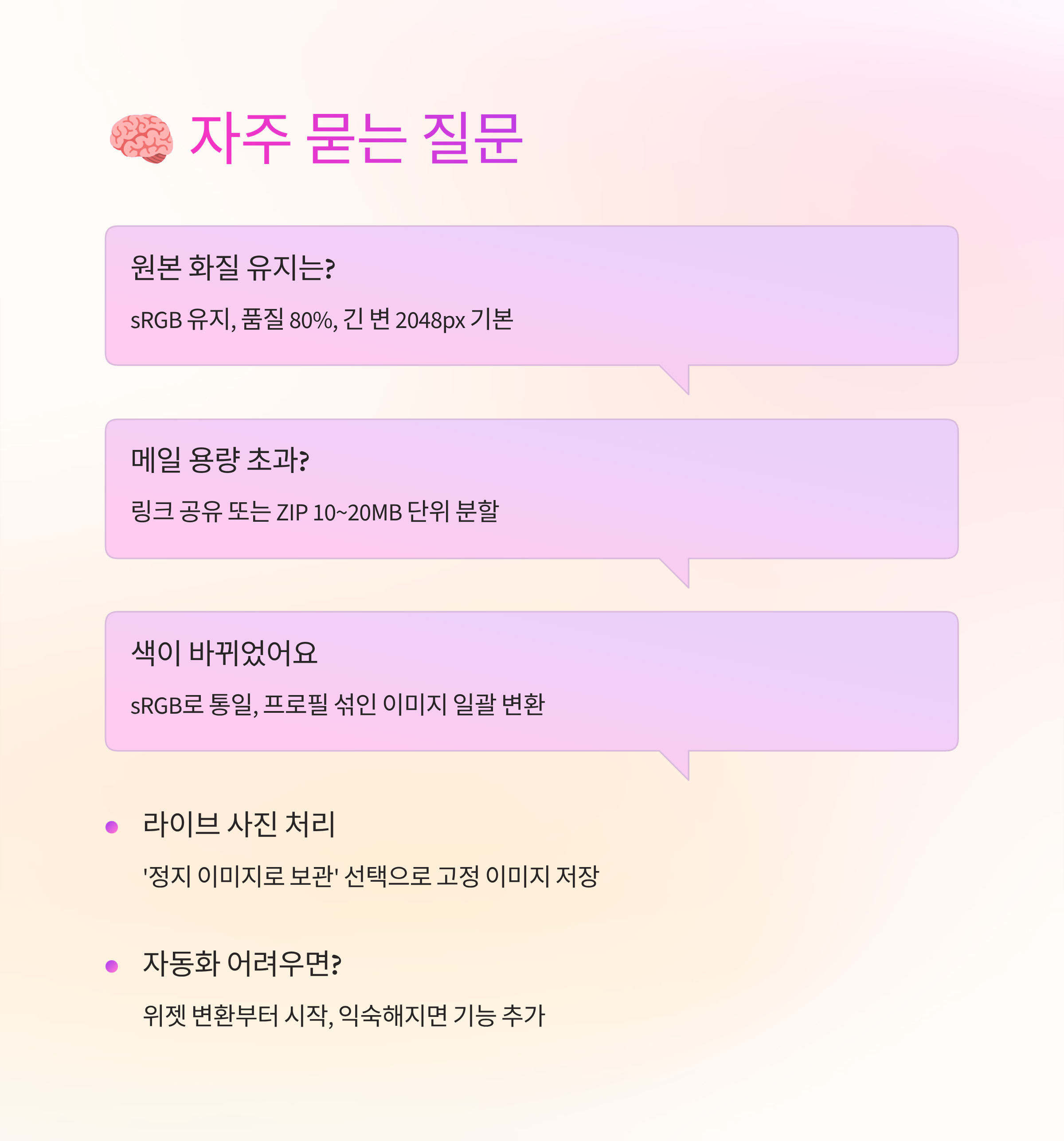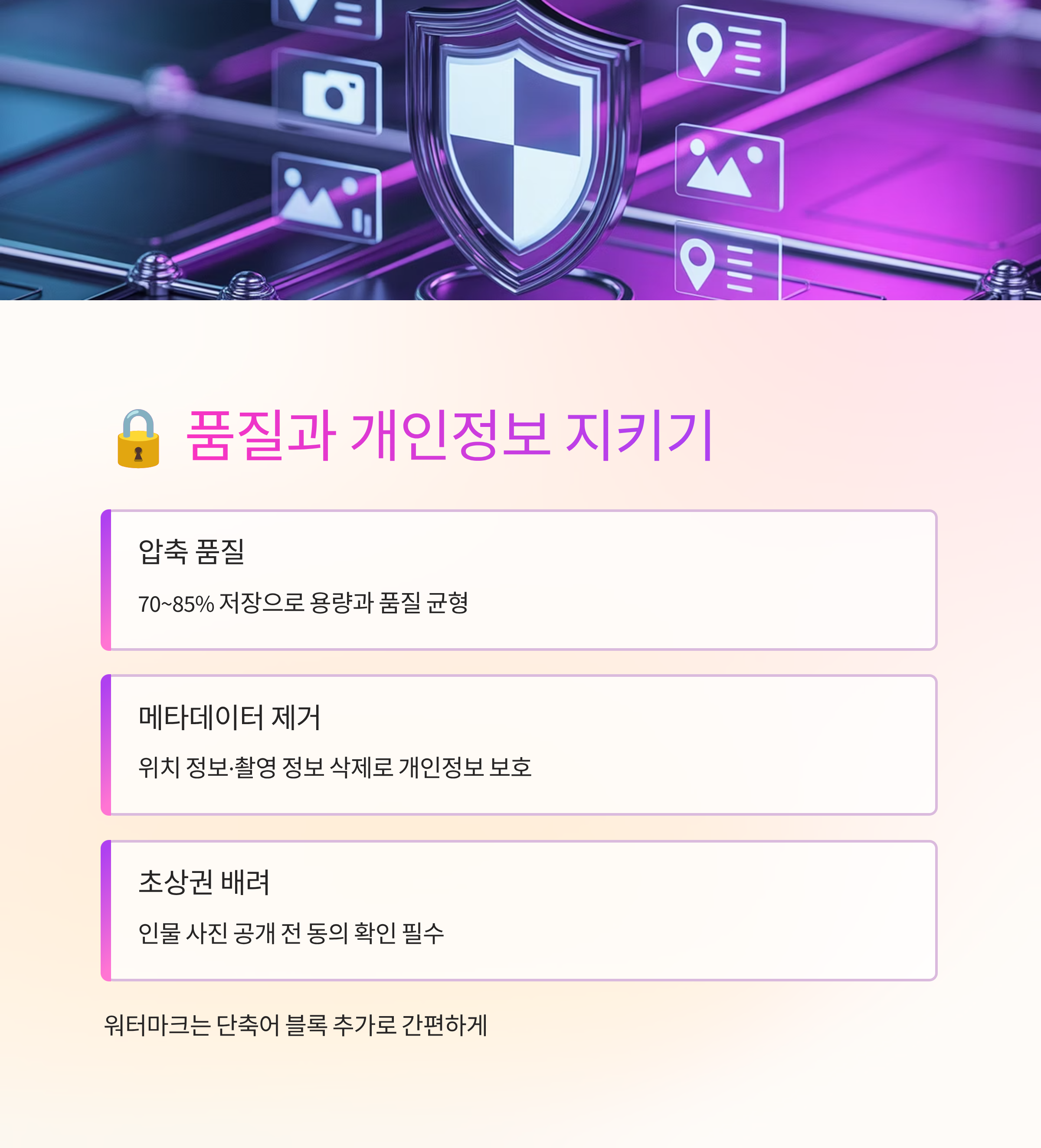 압축을 과하게 걸면 피부나 하늘 그라데이션이 깨져 보여요. 미리보기에서 70~85% 정도로만 저장해 보세요. 용량과 품질이 적당히 균형을 잡아요. 워터마크가 필요하면 단축어에 덧입히는 블록을 하나 추가하면 돼요.