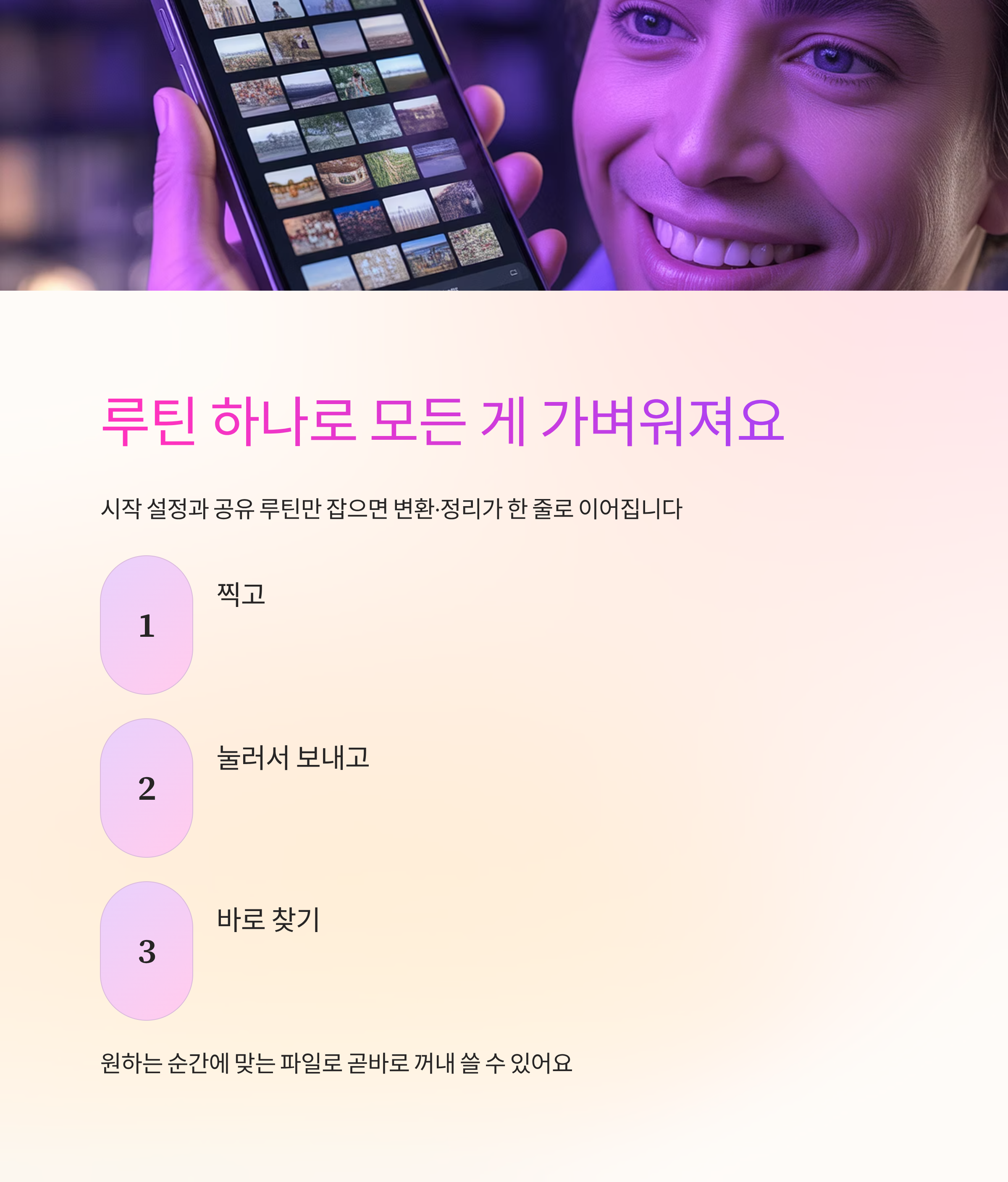 사진은 결국 쌓이고, 쌓인 만큼 관리가 일이 되죠. 시작 설정과 공유 루틴만 잡아두면 변환과 정리가 한 줄로 이어져요. 오늘 만든 단축어와 정리 규칙을 한 번만 돌려보세요. 다음부터는 찍고, 눌러서 보내고, 찾는 과정이 훨씬 가벼워져요. 원하는 순간에 맞는 파일로 곧바로 꺼내 쓸 수 있을 거예요.