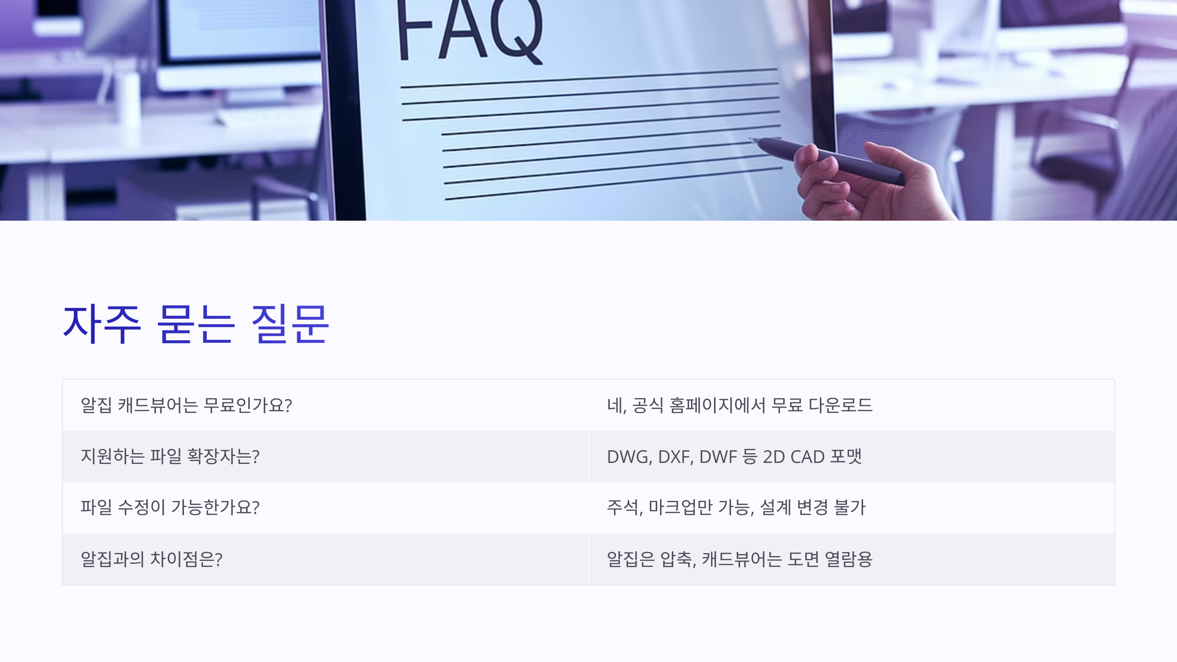 A4: 네, 알집은 압축 프로그램이고 알집 캐드뷰어는 CAD 도면을 열람하는 뷰어입니다. 이름이 비슷하지만 용도는 다릅니다.