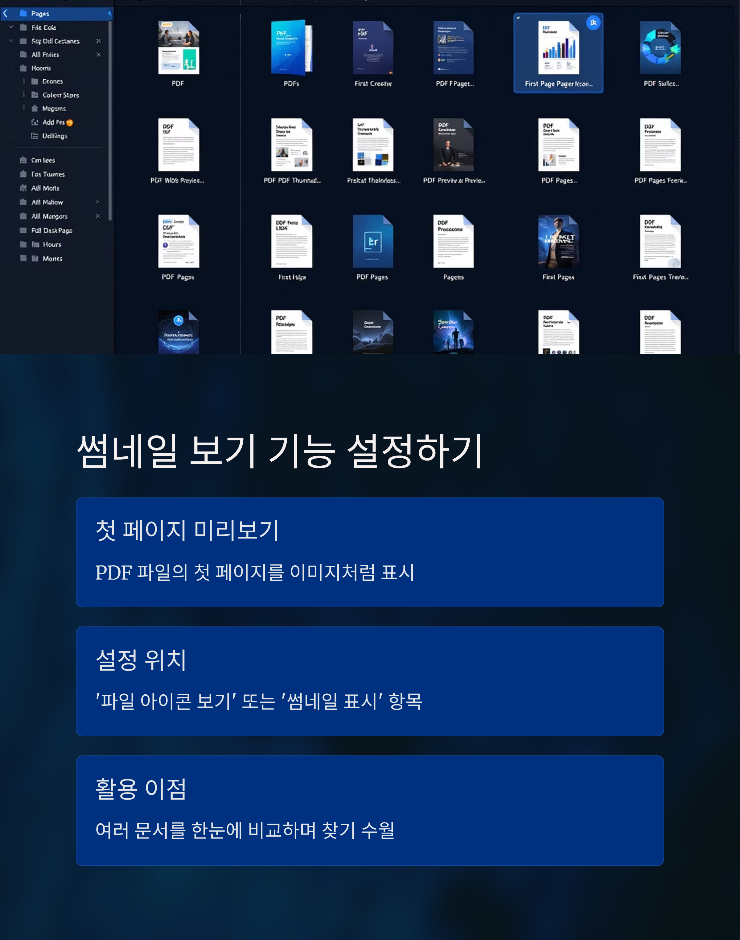 단순 미리보기 외에도 탐색기에서 PDF 파일의 첫 페이지를 이미지처럼 보여주는 썸네일 기능도 활용하실 수 있어요. 이 기능은 ‘파일 아이콘 보기’ 또는 ‘썸네일 표시’ 항목에서 설정 가능하구요.