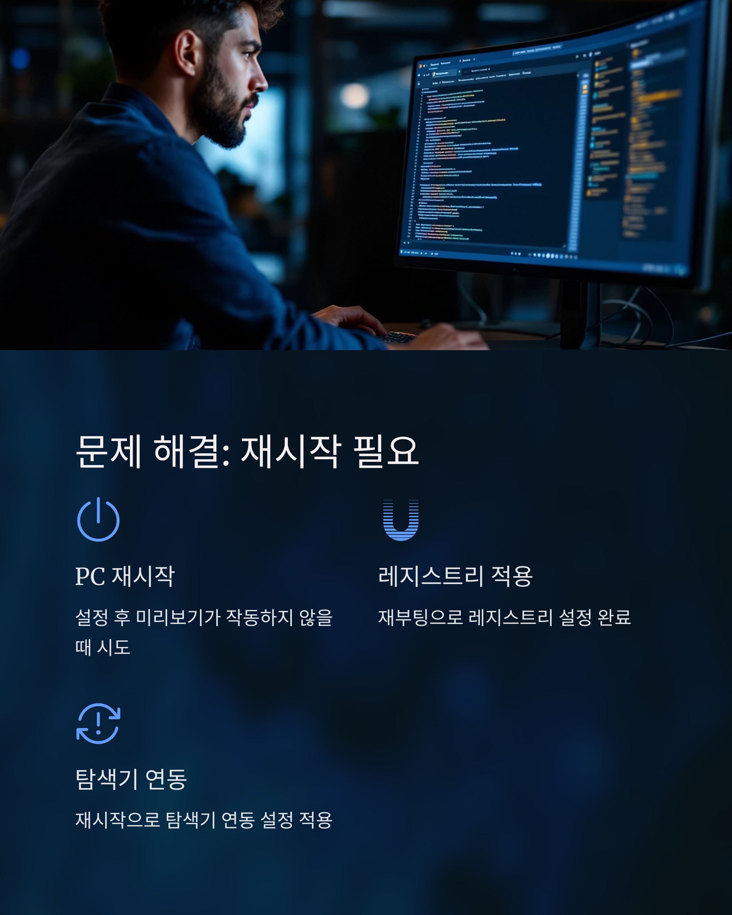 설정을 마쳤는데도 미리보기가 작동하지 않는 경우가 있으시다면, 한 번 PC를 재시작해보시는 게 좋겠어요. 레지스트리나 탐색기 연동 설정이 적용되려면 재부팅이 필요한 경우가 많거든요.