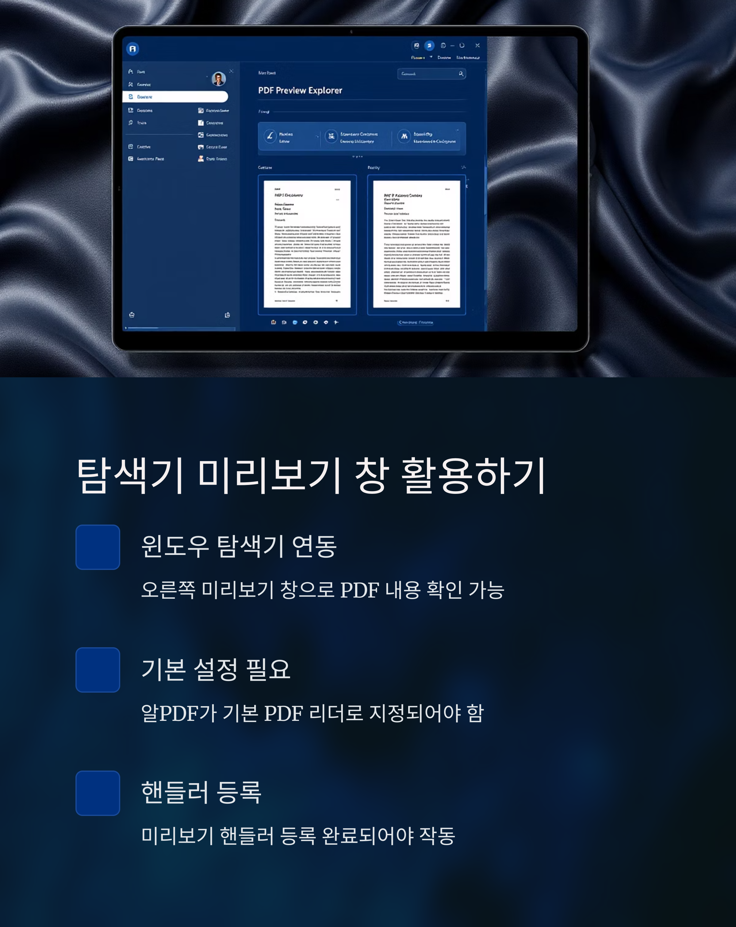 윈도우 파일 탐색기에서는 오른쪽 미리보기 창을 통해 PDF 내용을 확인하실 수 있어요. 단, 이 기능이 제대로 작동하려면 PDF 프로그램에서 관련 설정이 활성화되어 있어야 해요.