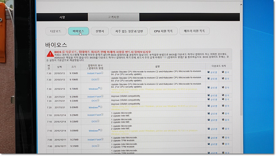 데스크탑 메인보드 에즈락 제품 바이오스 업데이트를 해보겠습니다.