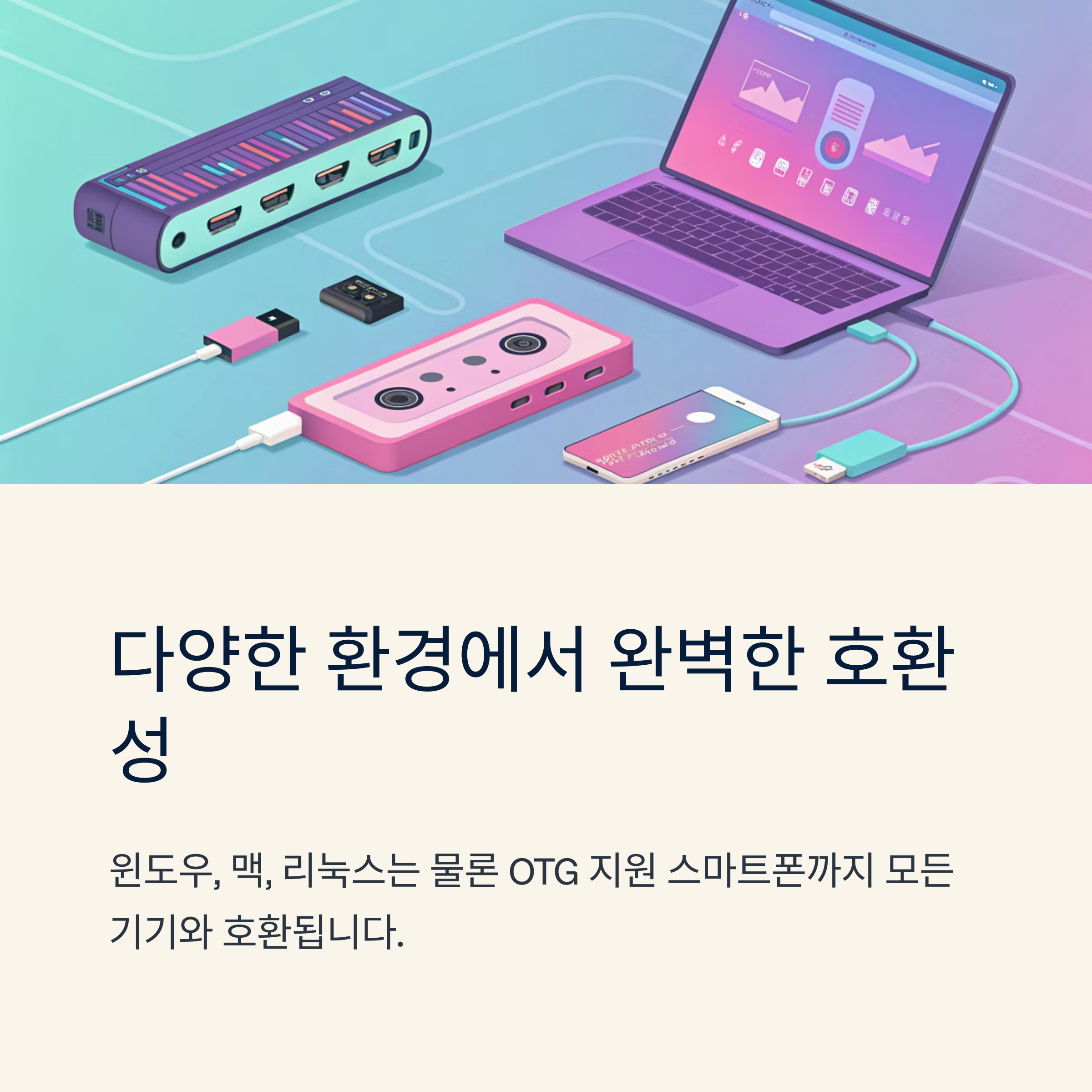 USB 포트가 있는 기기라면 대부분 호환되기 때문에, 프린터, 차량 오디오, 셋톱박스 등에서도 잘 작동했어요. 이런 폭넓은 호환성이 실제 사용 환경을 훨씬 편하게 만들어준다는 걸 실감했답니다.