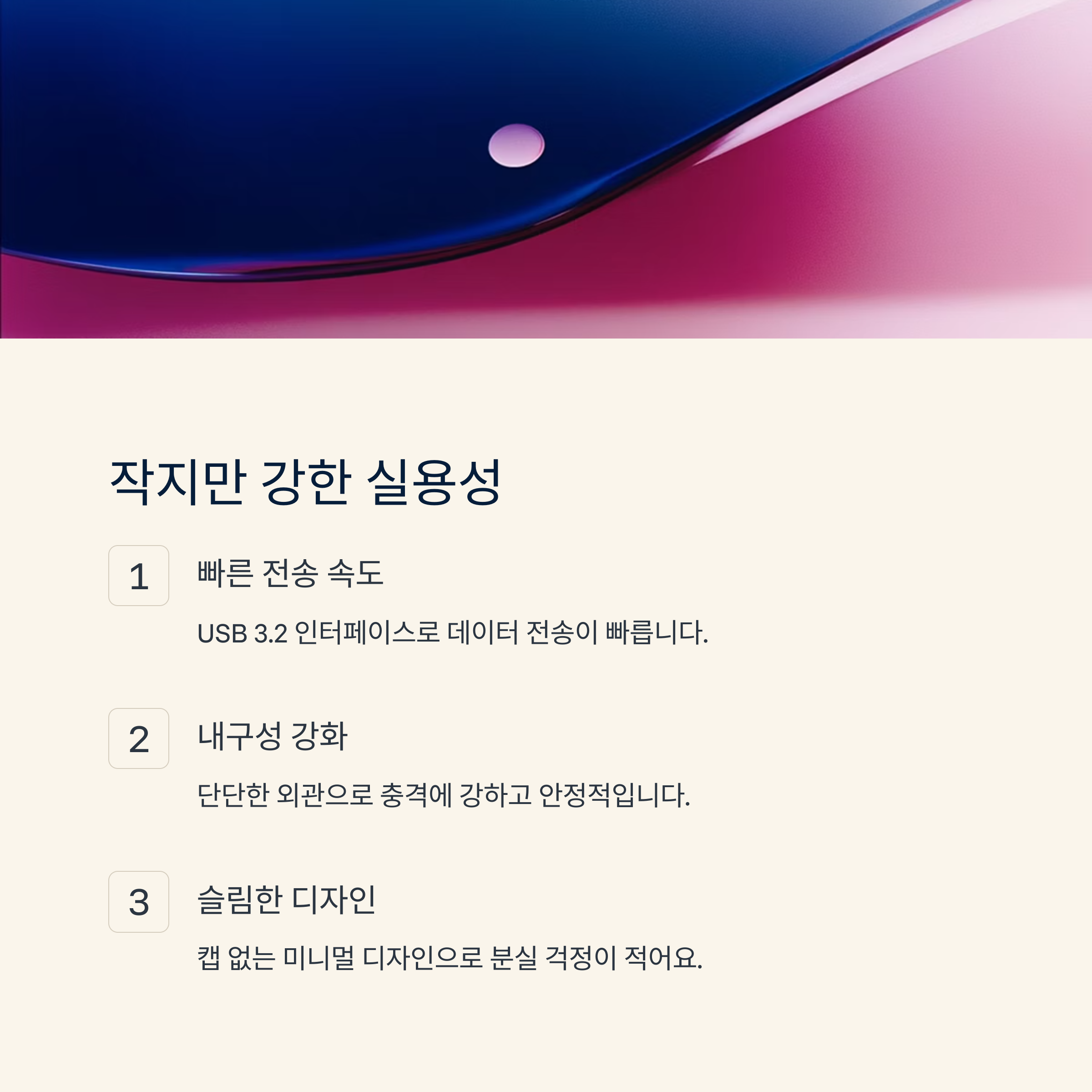 데이터를 자주 다루는 환경에서는, 작지만 튼튼하고 빠른 저장 장치가 필요해요. 오늘 소개해드린 이 제품은 그런 조건을 잘 충족해주는 USB였답니다. 특히 실사용자의 관점에서 안정성과 휴대성, 디자인까지 두루 만족스러운 구성이었어요. 앞으로도 USB 선택에 고민이 있으시다면, 이 제품을 한 번쯤 고려해보셔도 좋겠어요.