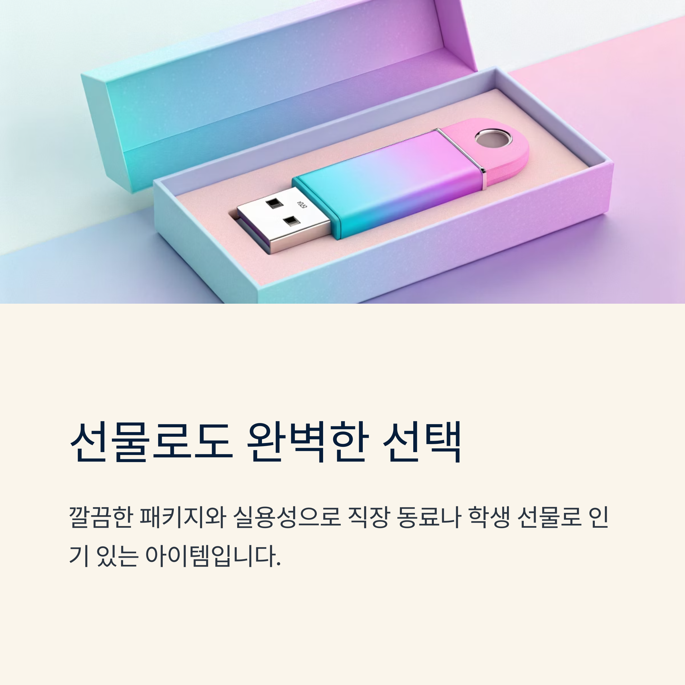 USB는 실용적인 만큼 선물용으로도 자주 선택되는데요, 이 제품은 깔끔한 패키지와 포장 디자인 덕분에 선물용으로도 손색없었어요. 특히 직장 내 팀원이나 학생 선물로 부담 없는 가격대에 실용성을 챙길 수 있다는 게 장점이었답니다.