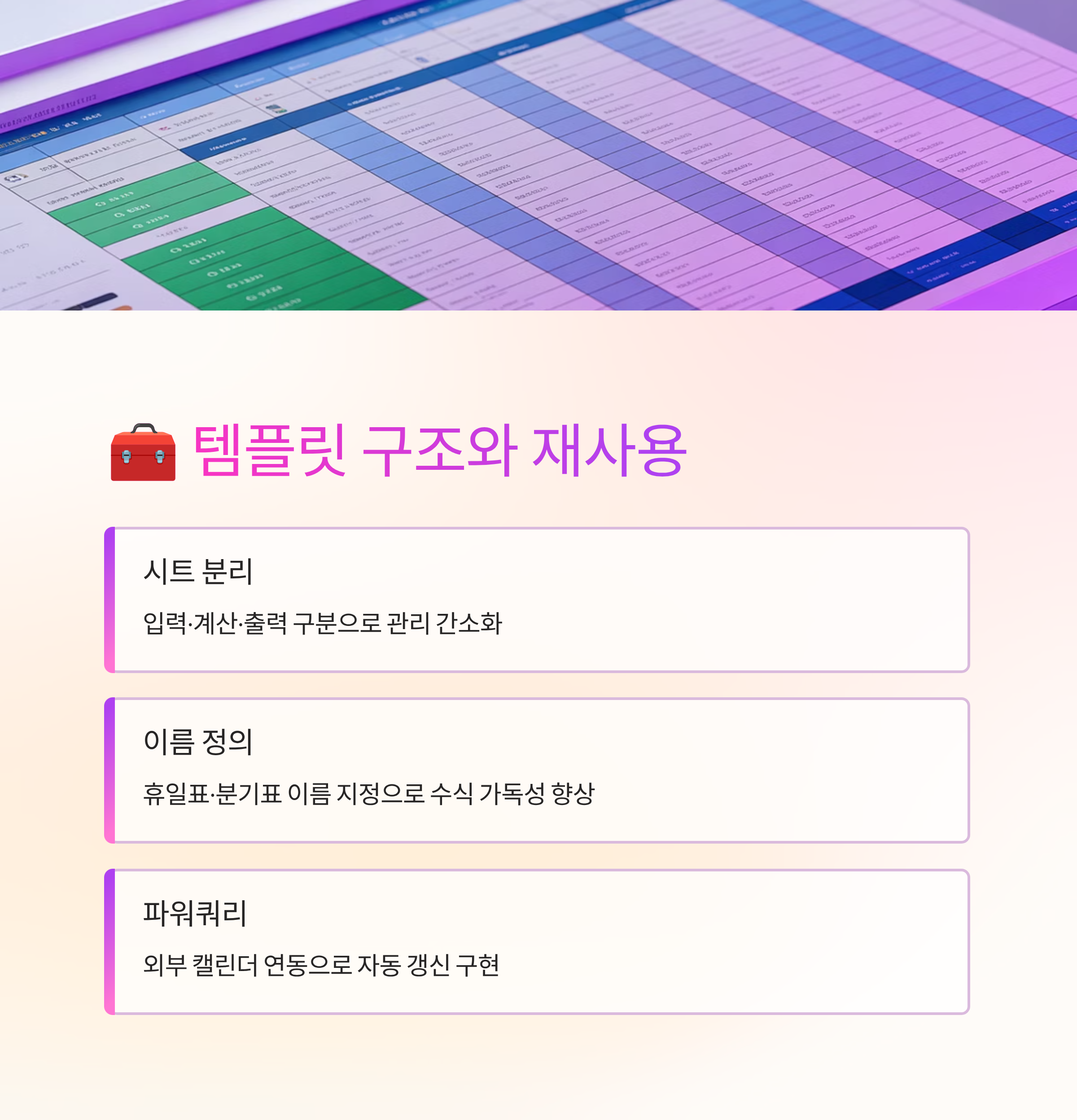 입력·계산·출력 시트를 분리하고, 계산 시트엔 오늘 날짜(TODAY)와 기준 표만 두면 관리가 가벼워요. 휴일표와 분기표는 이름을 정의해 참조하면 수식이 읽기 쉬워지고 오류도 줄어요. 날짜는 텍스트로 들어오기 쉬우니 변환 열을 따로 두고, 원본을 건드리지 않는 게 안전해요.
