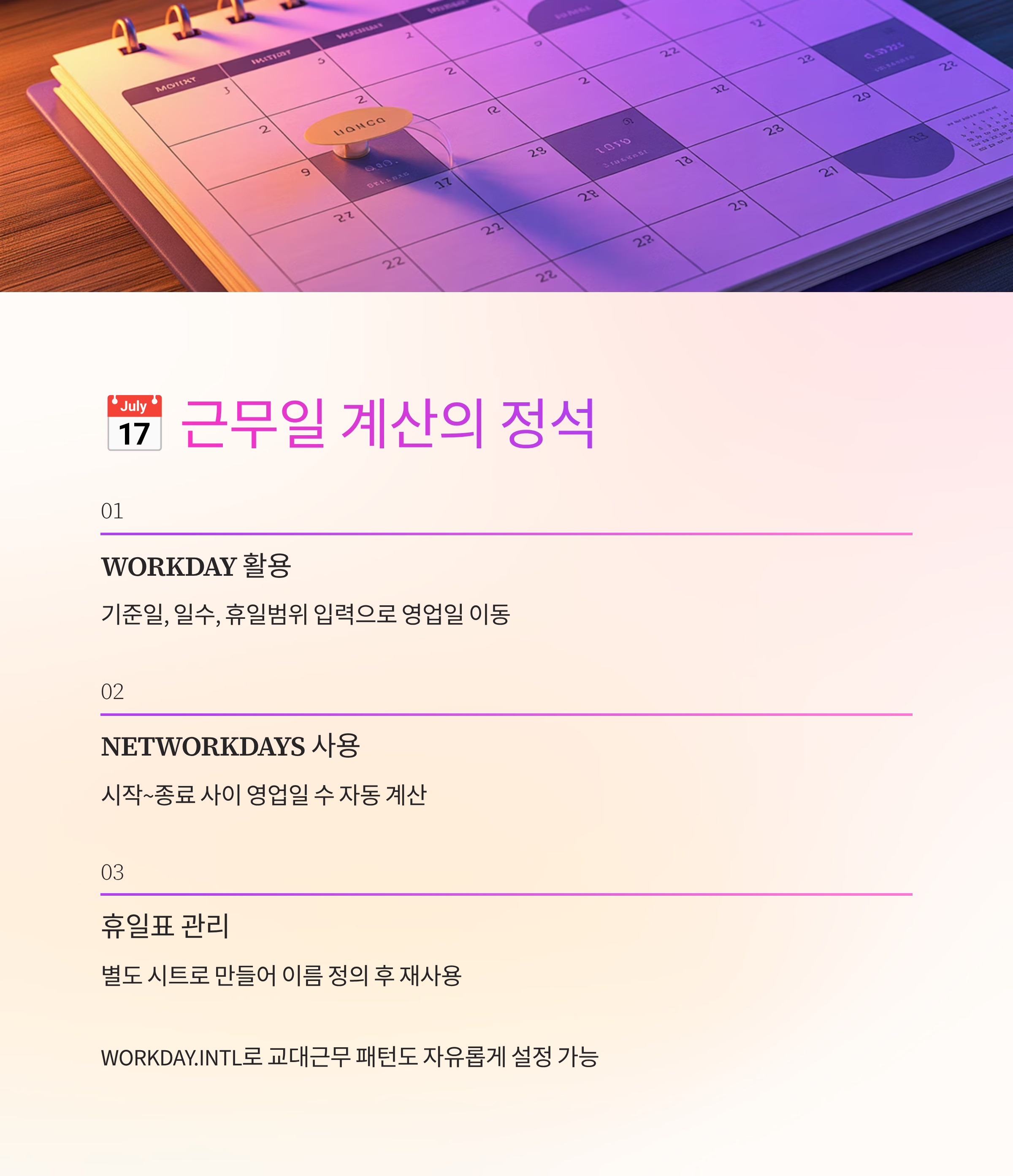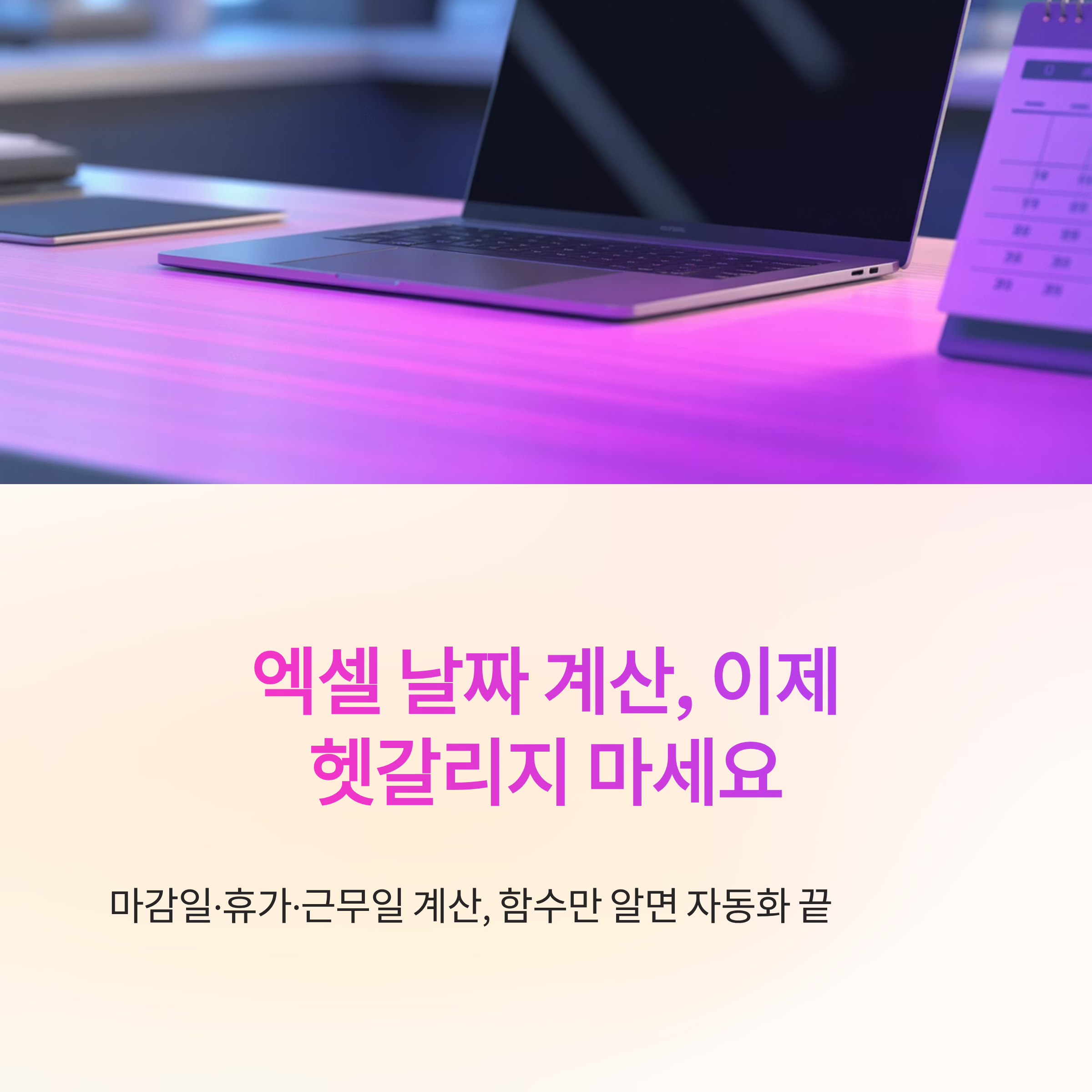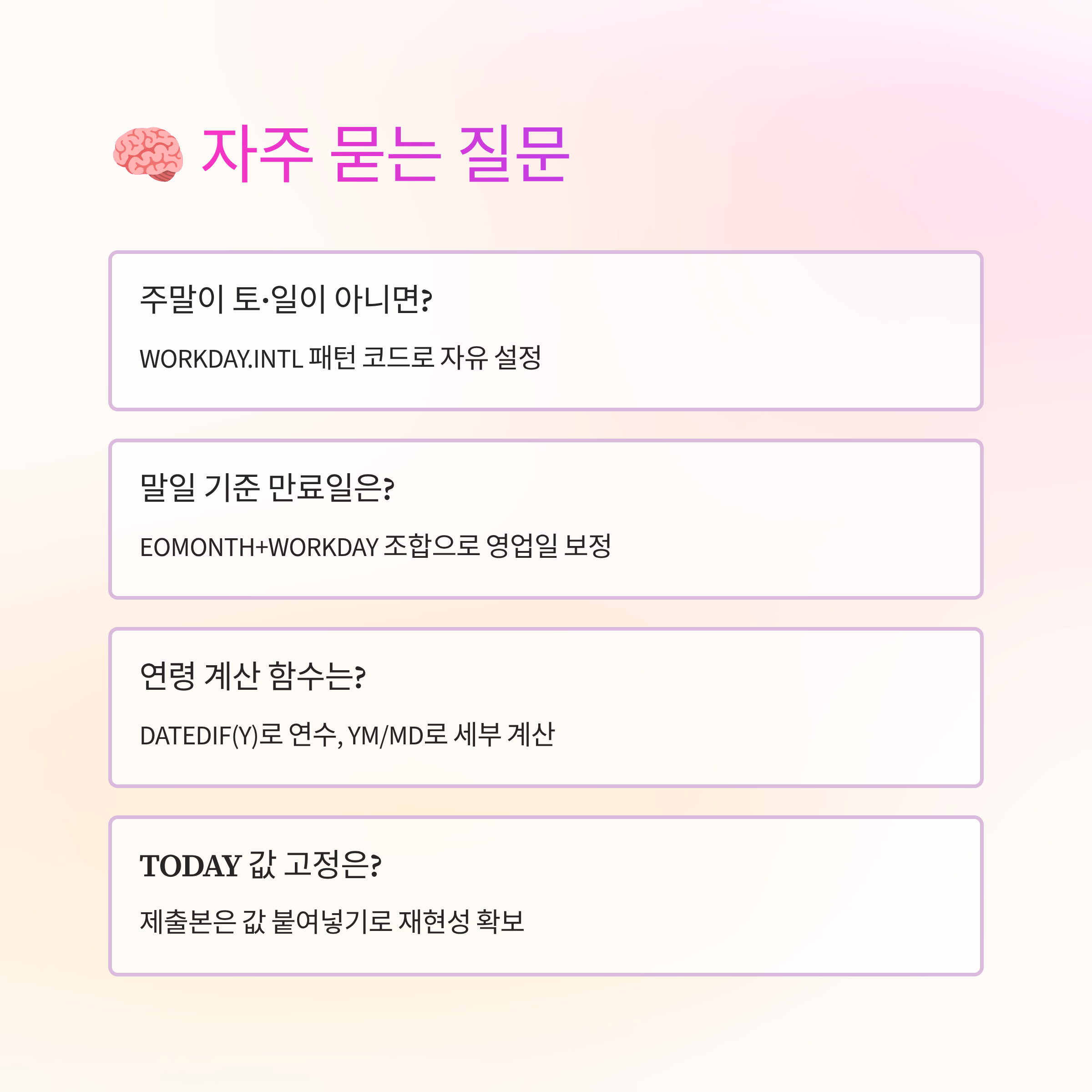 날짜 계산은 규칙 싸움이더라고요. 포함 범위와 주말 처리만 합의해 두면 함수는 자연스럽게 따라와요. 오늘 정리한 흐름을 템플릿으로 저장해 두고, 다음 프로젝트부터 그대로 복붙해 보세요. 며칠만 지나도 휴일·말일·분기초 같은 까다로운 케이스가 한 번에 정리되고, 보고서 검수 시간도 눈에 띄게 줄 거예요.