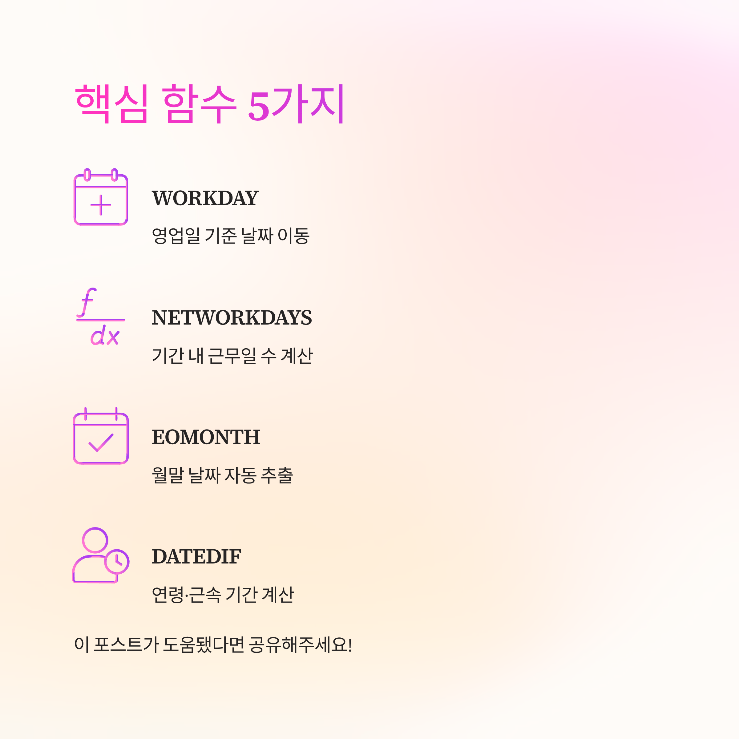 보고서에 마감일을 자동으로 뽑거나, 휴가 끝나는 날짜를 정확히 계산해야 할 때가 정말 많아요. 날짜는 겉으로는 단순해 보여도 주말·공휴일·월말 같은 예외가 끼면 금방 꼬이더라고요. 함수 이름도 비슷비슷해서 처음엔 뭘 써야 할지 망설이기 쉽죠. 하지만 기준만 잡아두면 생각보다 간단하게 해결되더라고요. 오늘은 가장 많이 쓰는 함수들을 목적별로 묶어, 언제 어떤 순서로 조합하면 되는지 깔끔하게 정리해볼게요.