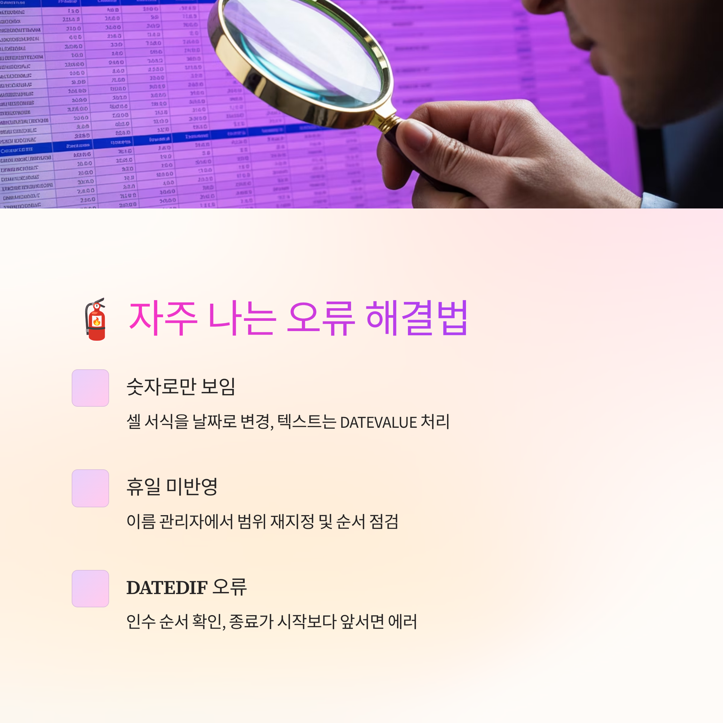 DATEDIF 오류는 인수 순서나 단위 코드 오타가 대부분이에요. 코드가 대문자인지 확인하고, 종료가 시작보다 빠르면 오류가 나는 점도 기억하세요. 마지막으로 TODAY는 휘발성이라, 제출본은 값으로 고정해 두면 재현이 쉬워요.