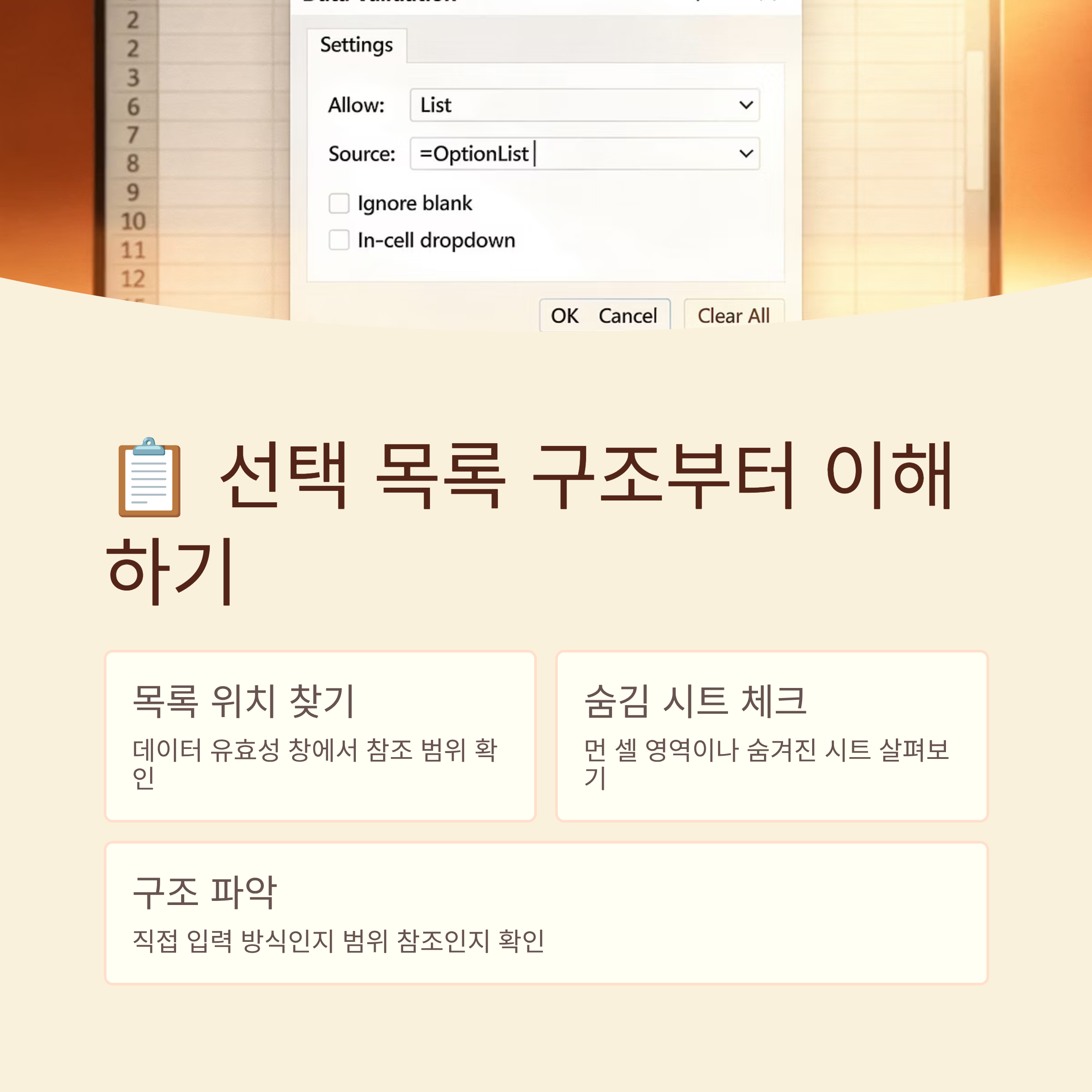 예전에 만들어 둔 파일을 열어 보면 드롭다운만 보이고 실제 목록은 어디에 있는지 안 보이는 경우가 많아요. 사실 대부분은 데이터 유효성 기능 안에 직접 값을 적어 두었거나, 숨겨 둔 범위를 참조하도록 설정해 두었을 가능성이 크거든요. 그래서 첫 단계는 이 목록이 셀 범위를 쓰는 방식인지, 입력창에 값을 바로 적어 둔 방식인지부터 확인하는 거예요.